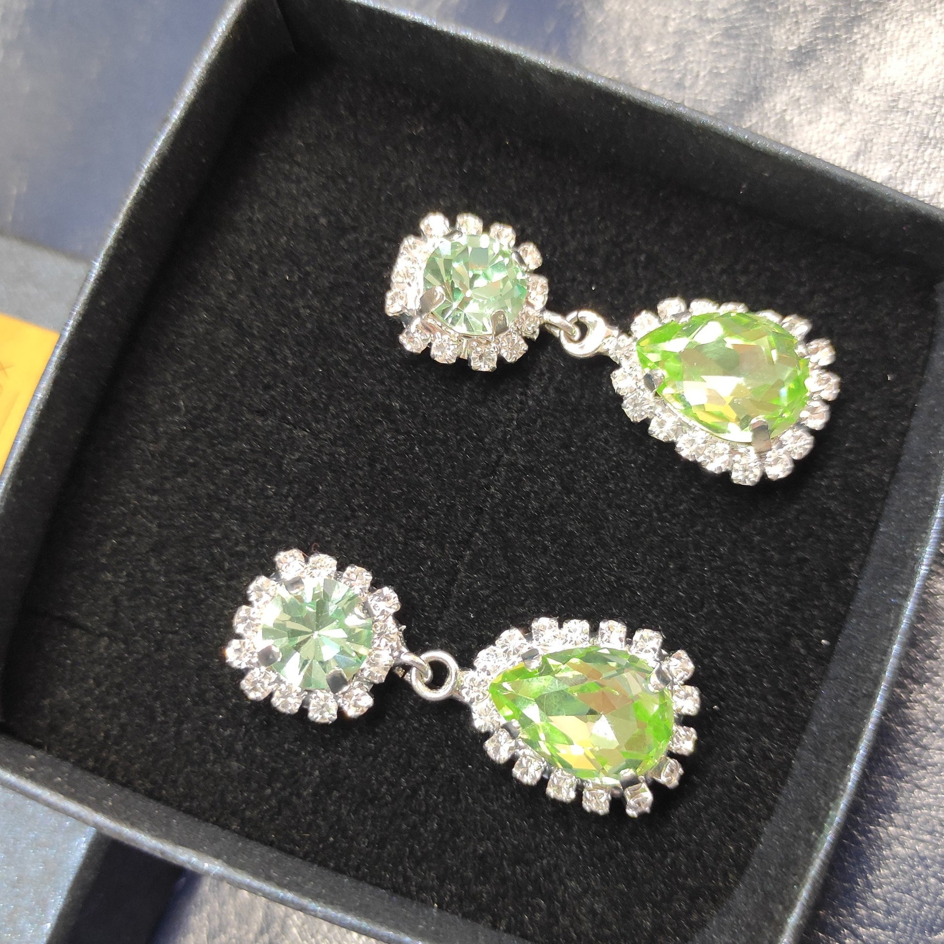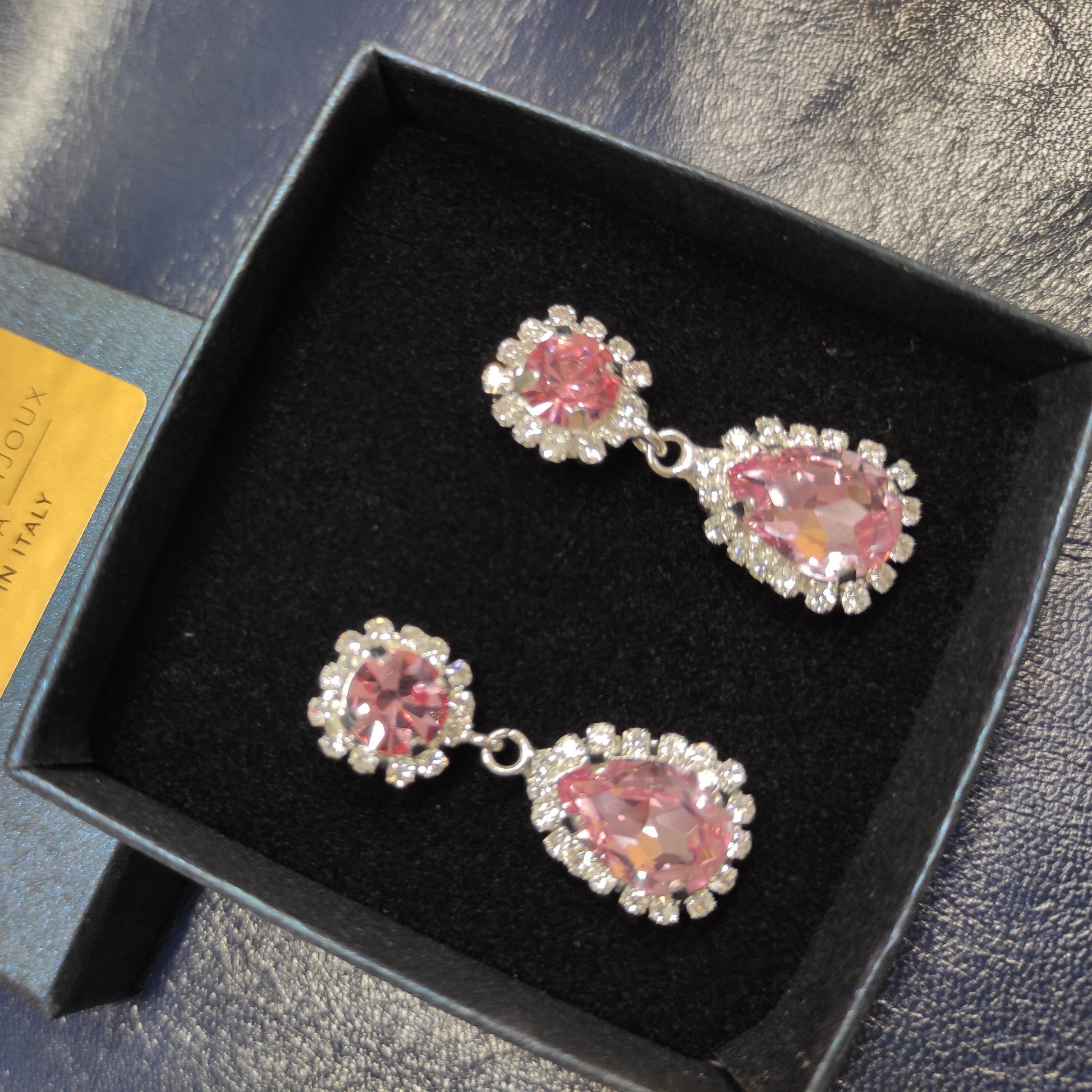 Orecchini con pendente realizzati in ottone placcato oro o argento con lega in stagno, arricchiti da strass e pietre Swarovski, galvanica nickel free.