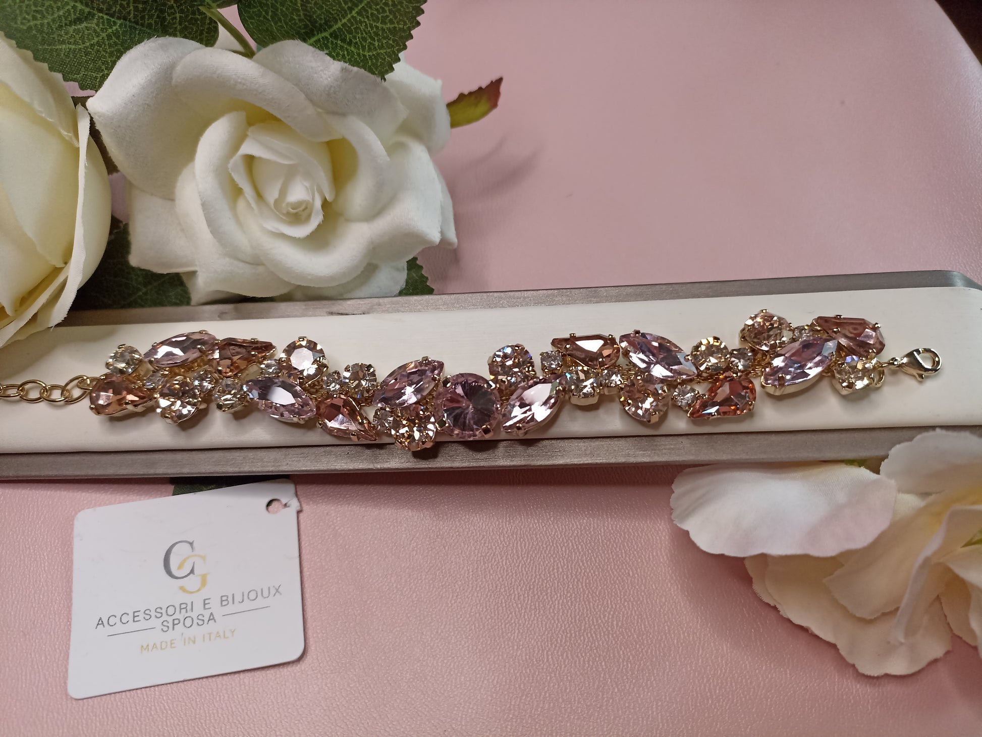 Bracciale realizzato in ottone placcato oro o argento con lega in stagno, impreziosito da strass e pietre Swarovski in vari tagli, galvanica nickel free.