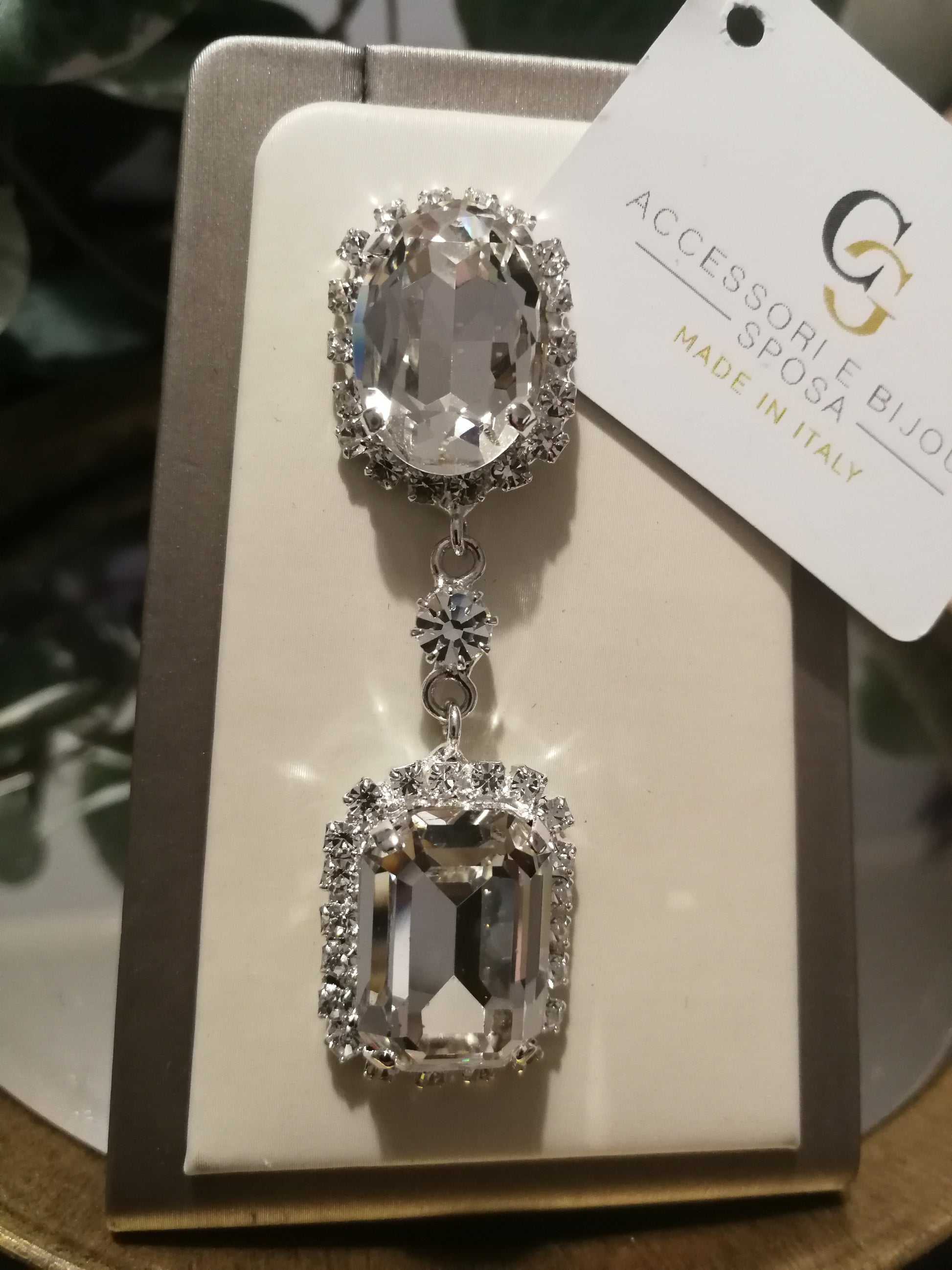 Orecchini con pendente realizzati in ottone placcato oro o argento con lega in stagno, impreziositi da strass e pietre Swarovski, galvanica nickel free.