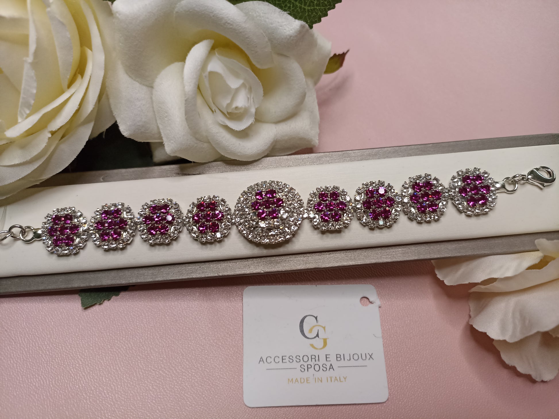 Bracciale realizzato in ottone placcato oro o argento con lega in stagno, impreziosito da strass e pietre Swarovski in vari tagli, galvanica nickel free.