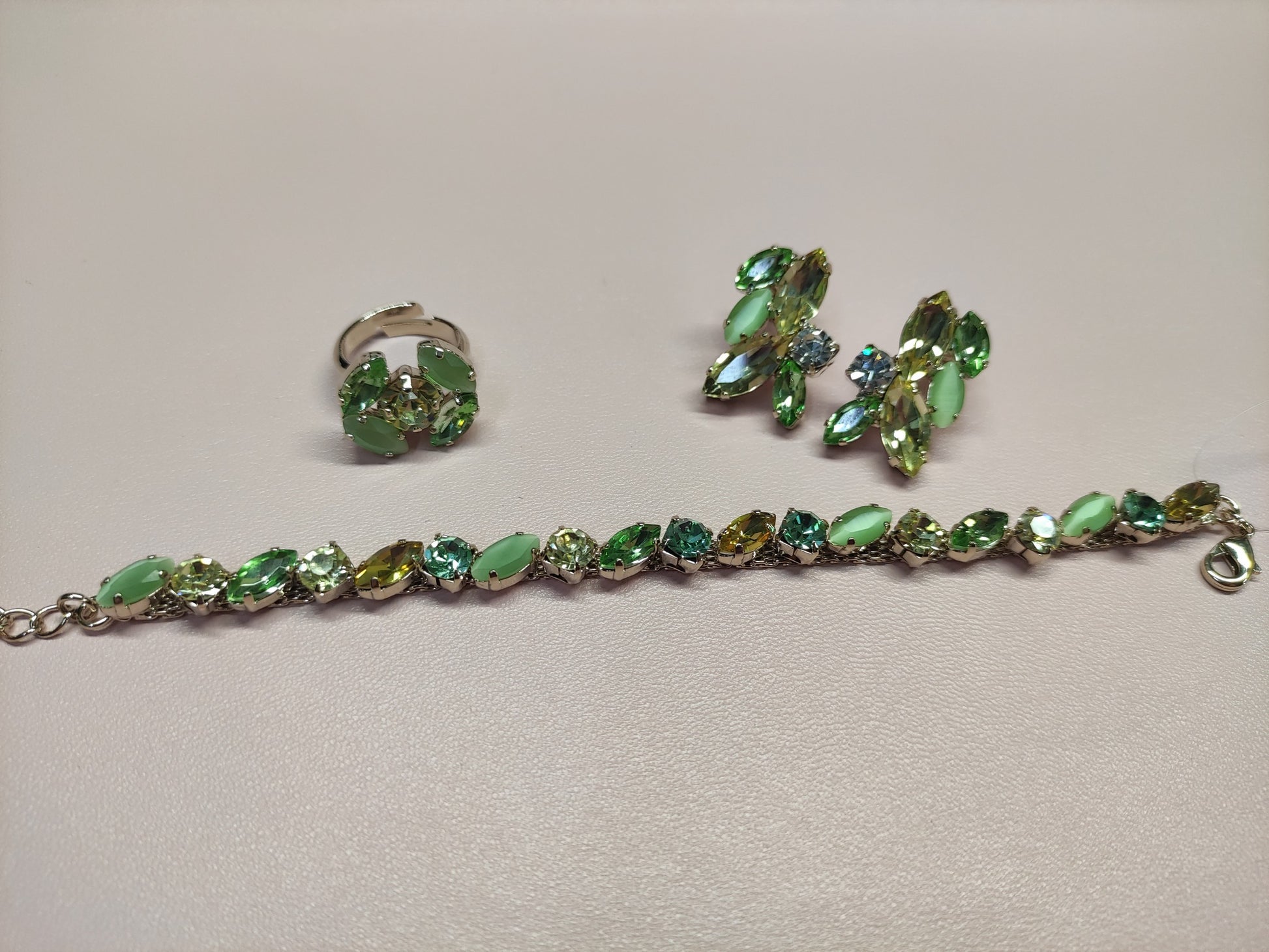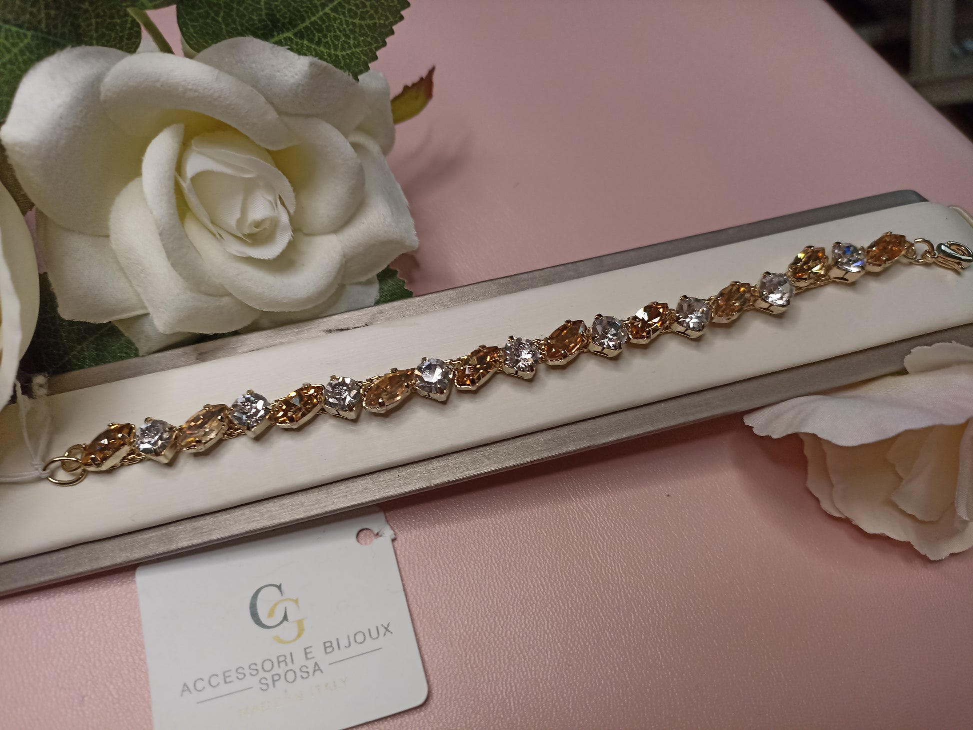 Bracciale con orecchini e anello abbinati, realizzati in ottone placcato oro o argento con lega in stagno, impreziositi da strass e pietre Swarovski in vari tagli, galvanica nichel free.