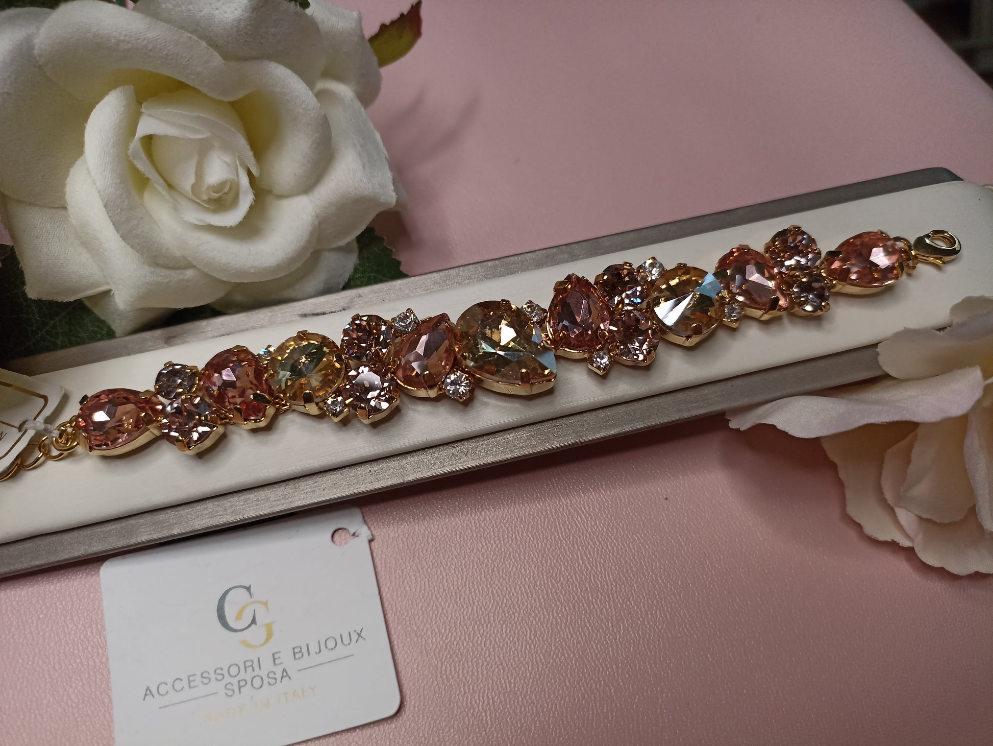 Bracciale realizzato in ottone placcato oro o argento con lega in stagno, impreziosito da strass e pietre Swarovski in vari tagli, galvanica nickel free.