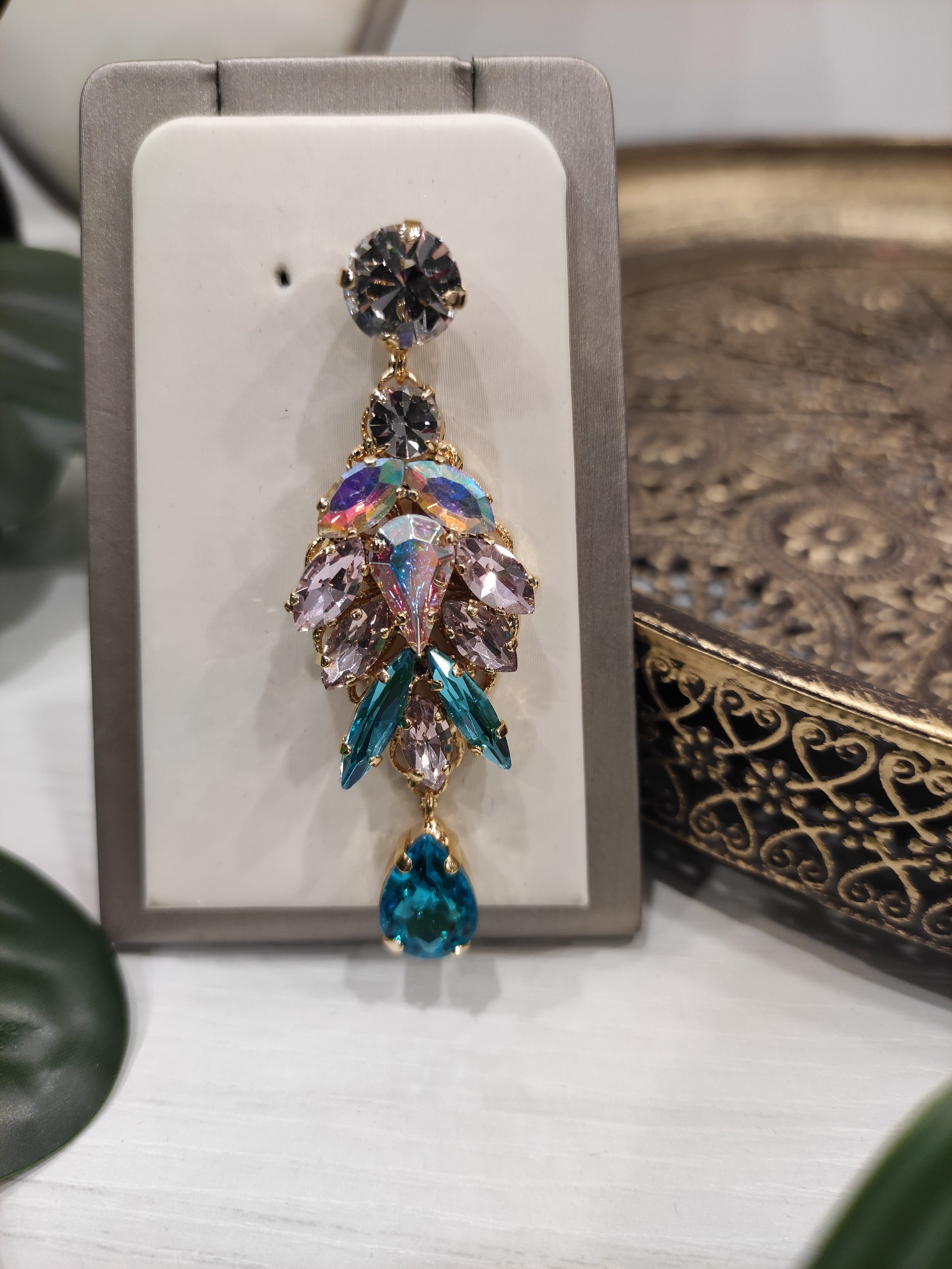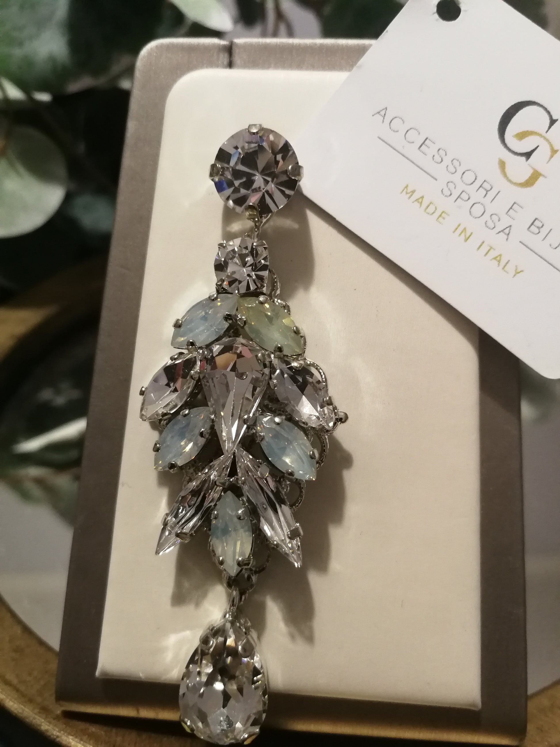 Orecchini pendenti realizzati in ottone placcato oro o argento con lega in stagno, arricchiti da pietre Swarovski, galvanica nickel free.