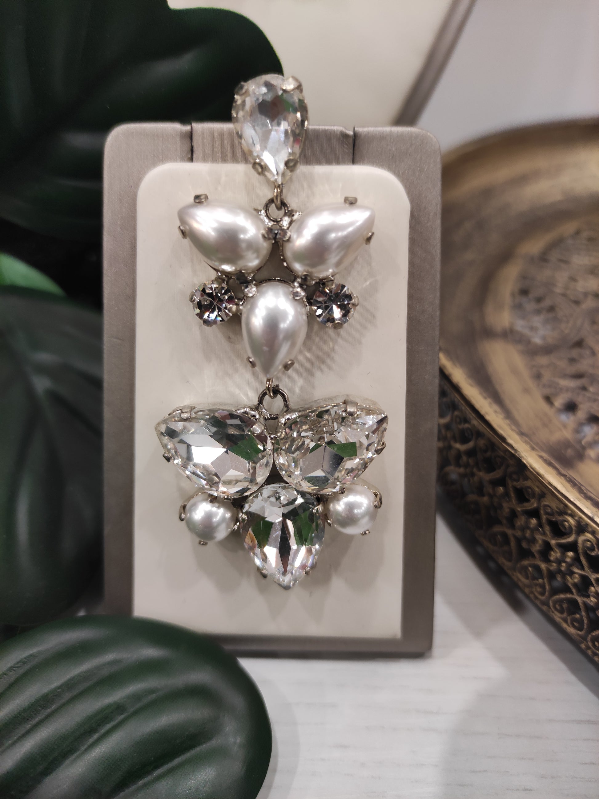 Orecchini pendenti realizzati in ottone placcato oro o argento con lega in stagno, arricchiti da strass e pietre Swarovski e perle, galvanica nickel free.