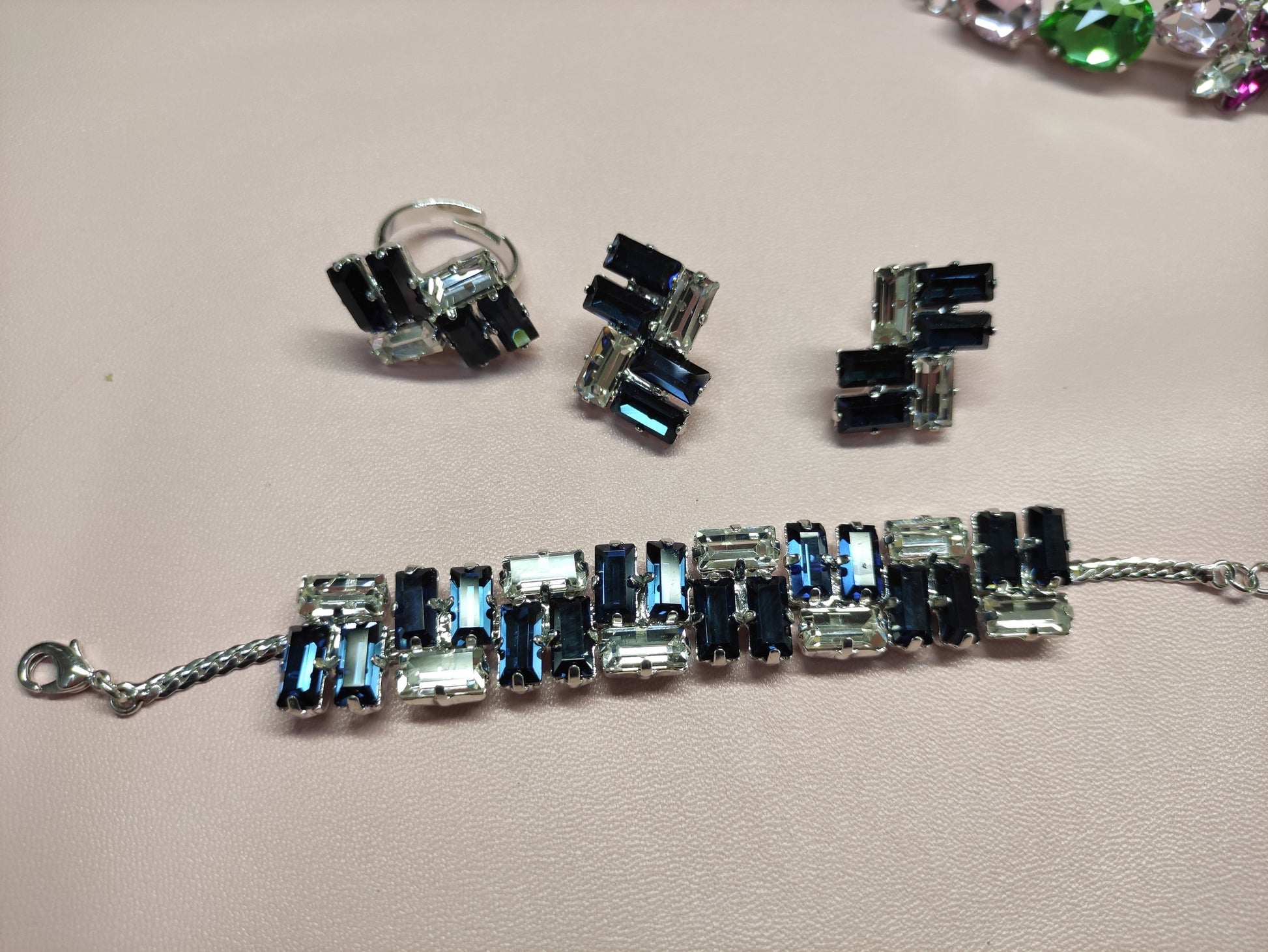 Bracciale con orecchini e anello abbinati, realizzati in ottone placcato oro o argento con lega in stagno, impreziositi da pietre Swarovski in vari tagli, galvanica nichel free.