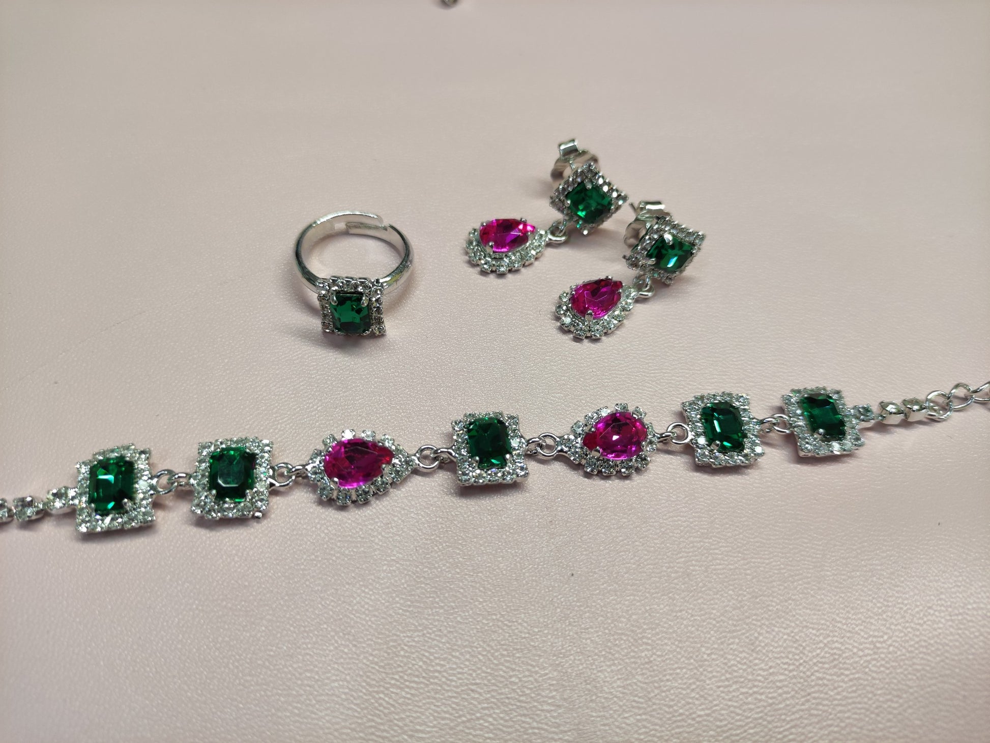Bracciale con orecchini e anello abbinati, realizzati in ottone placcato oro o argento con lega in stagno, impreziositi da strass e pietre Swarovski in vari tagli, galvanica nichel free.