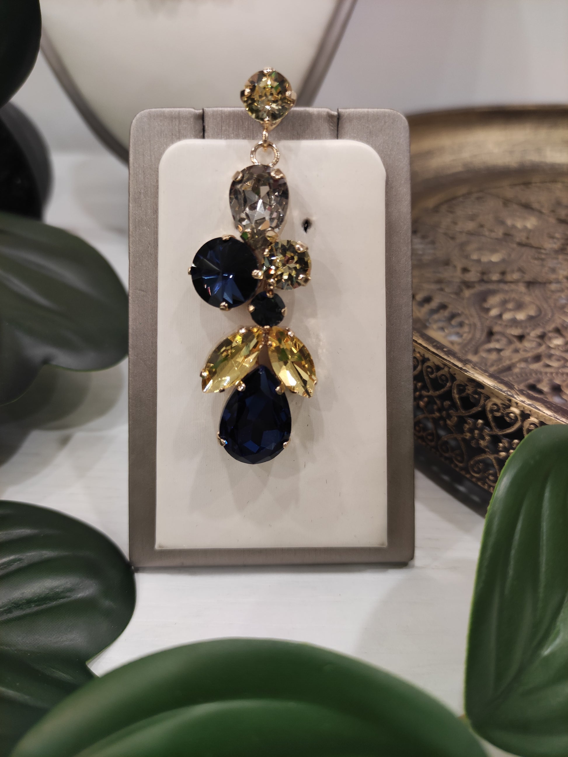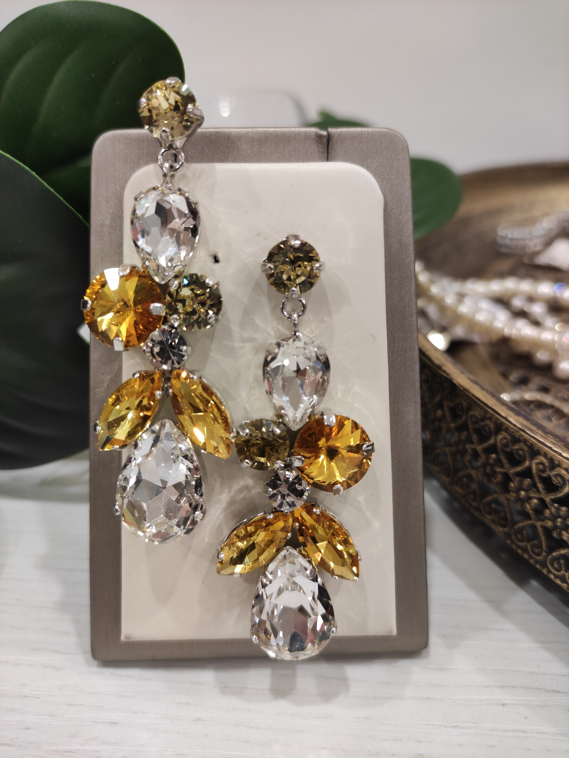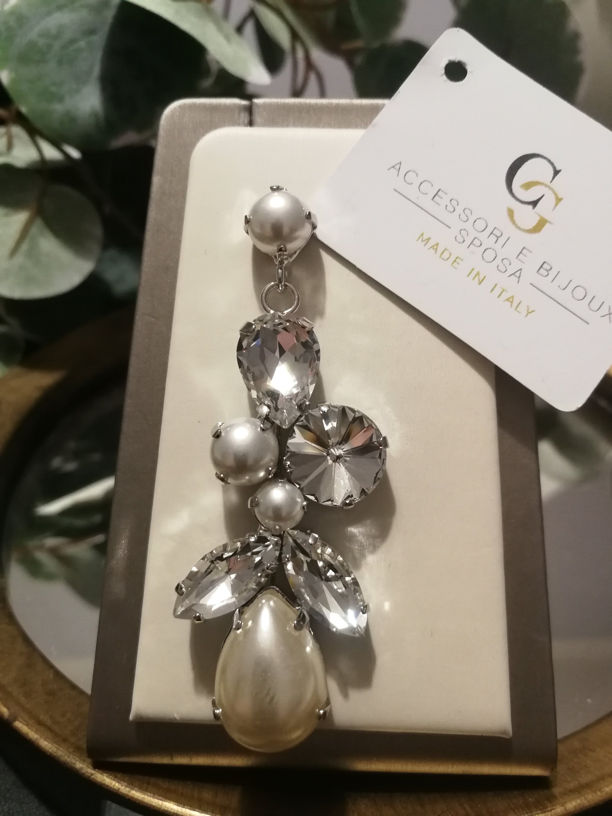 Orecchini con pendente realizzati in ottone placcato oro o argento con lega in stagno, impreziositi da strass e pietre Swarovski, galvanica nickel free.