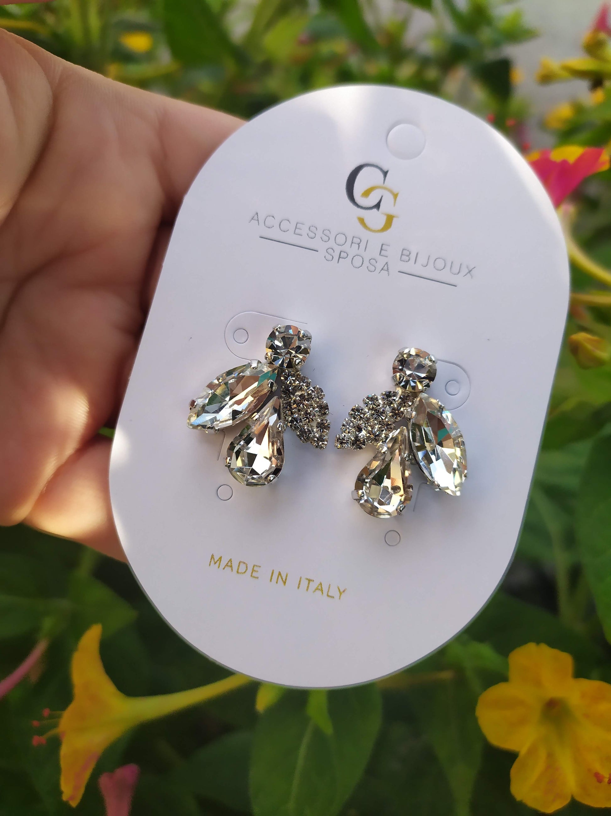 Orecchini realizzati in ottone placcato oro o argento con lega in stagno, arricchiti da foglioline di strass e pietre Swarovski, galvanica nickel free.