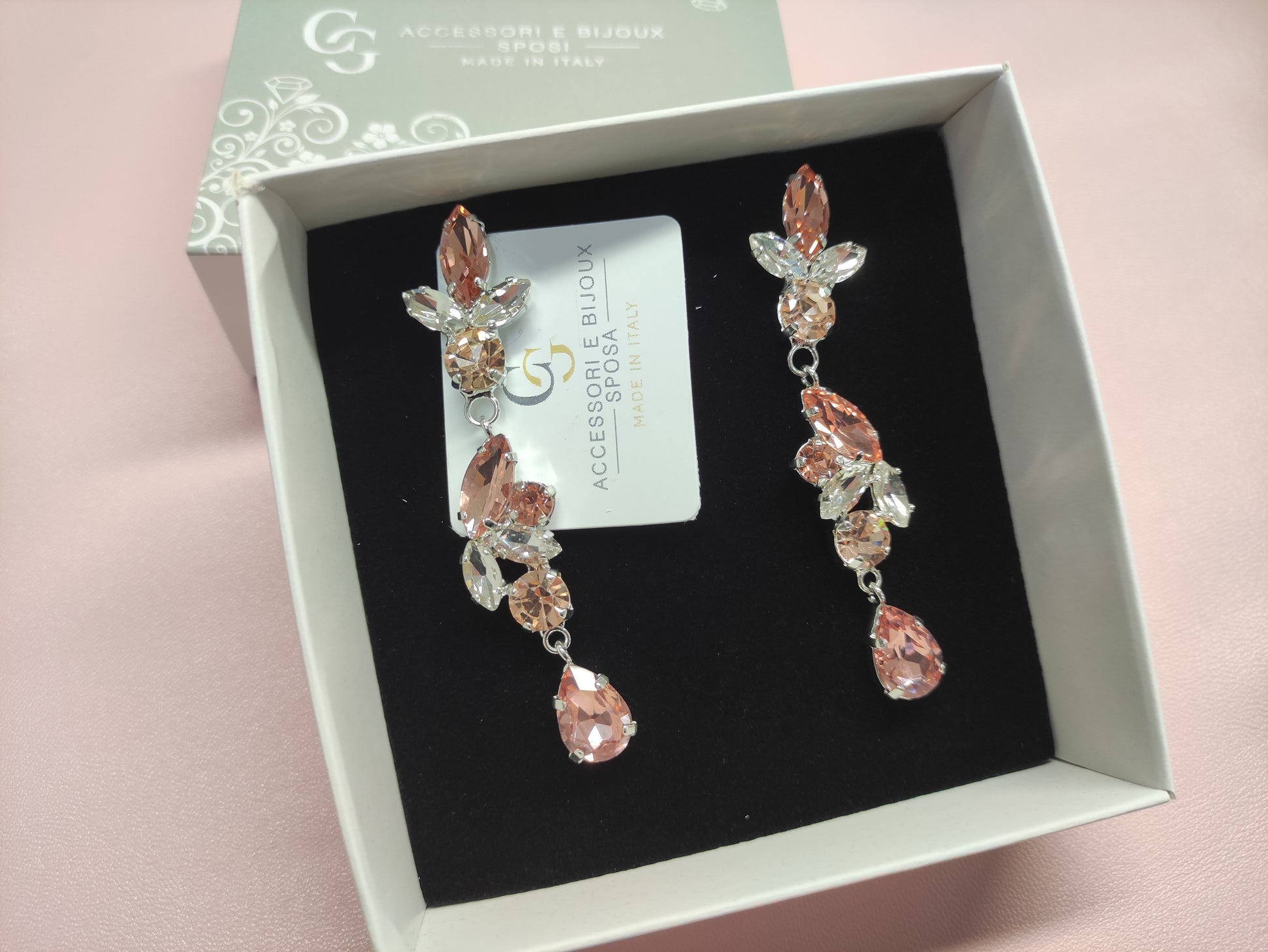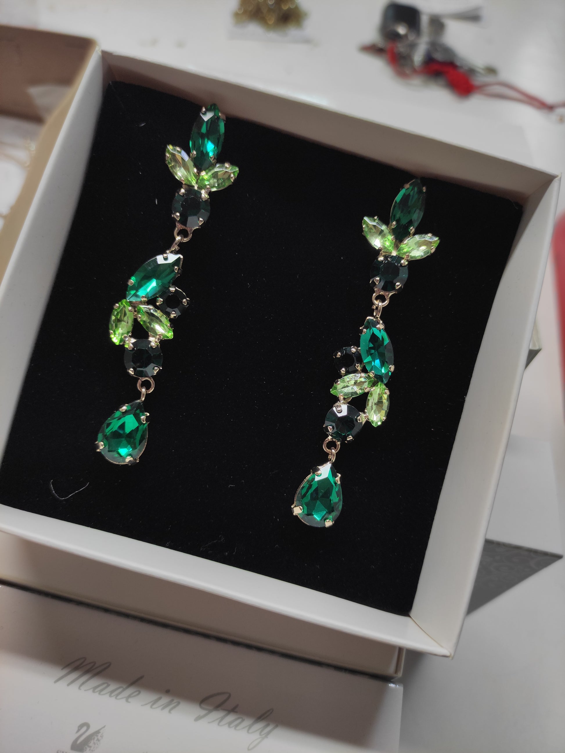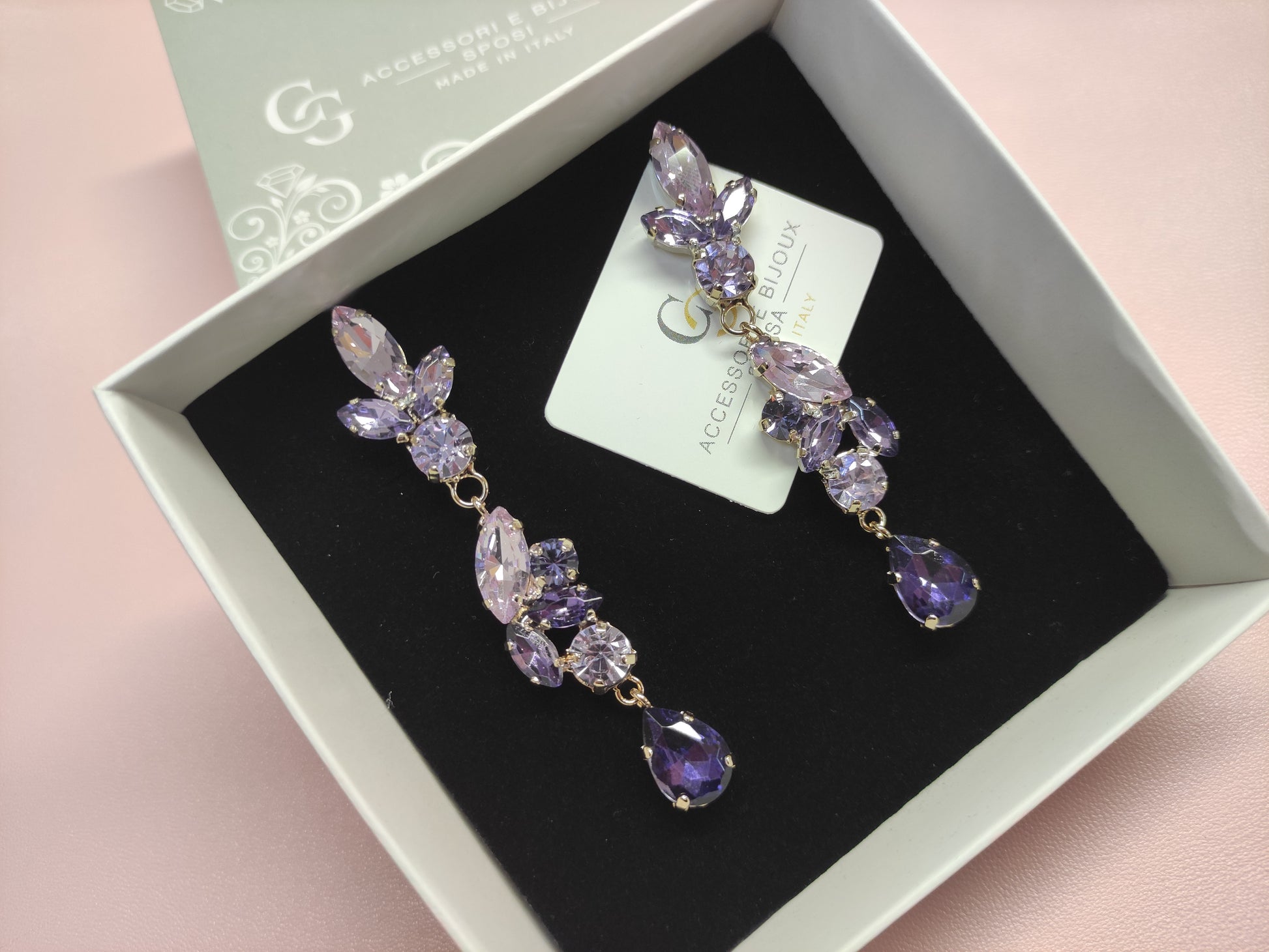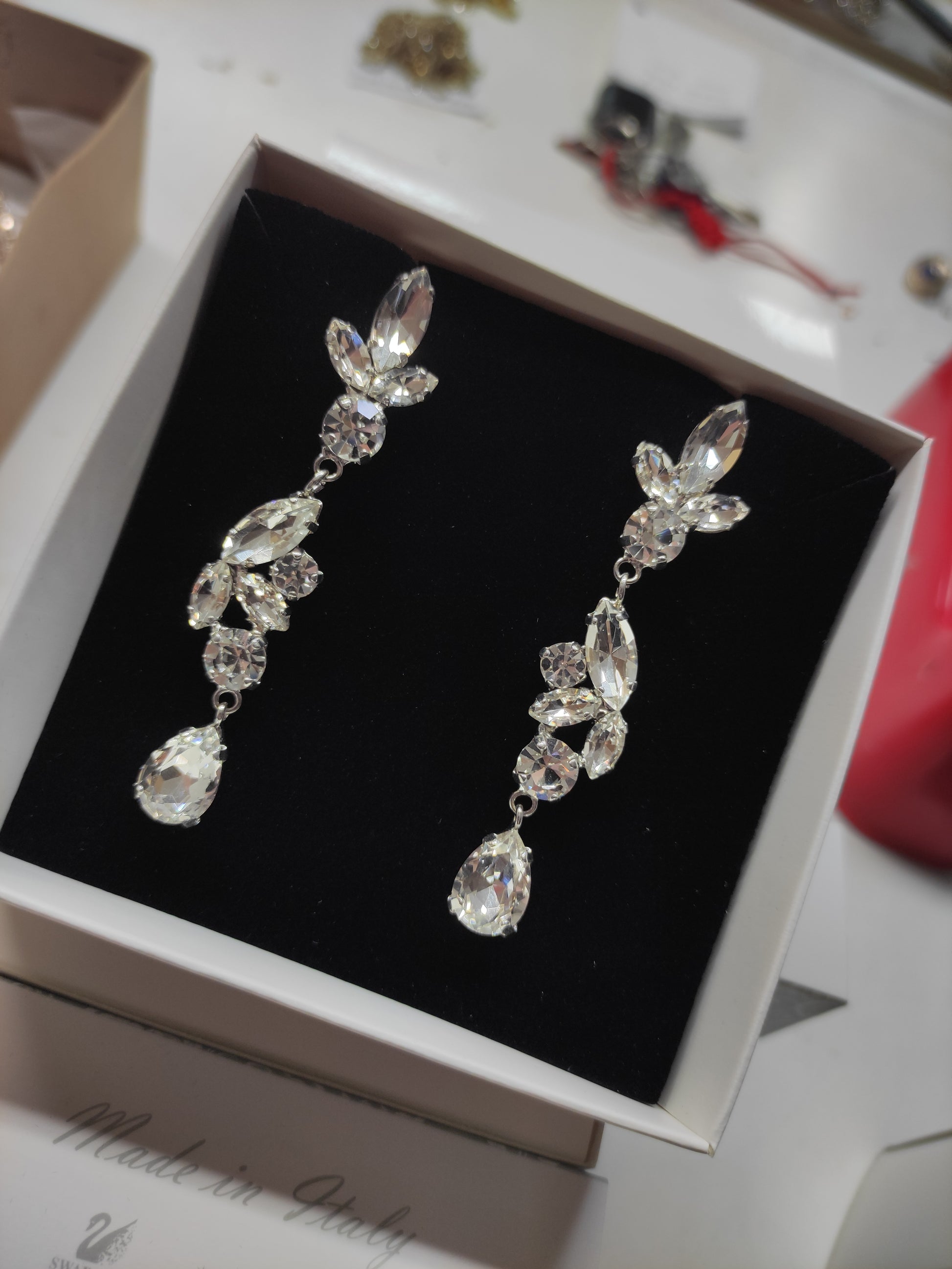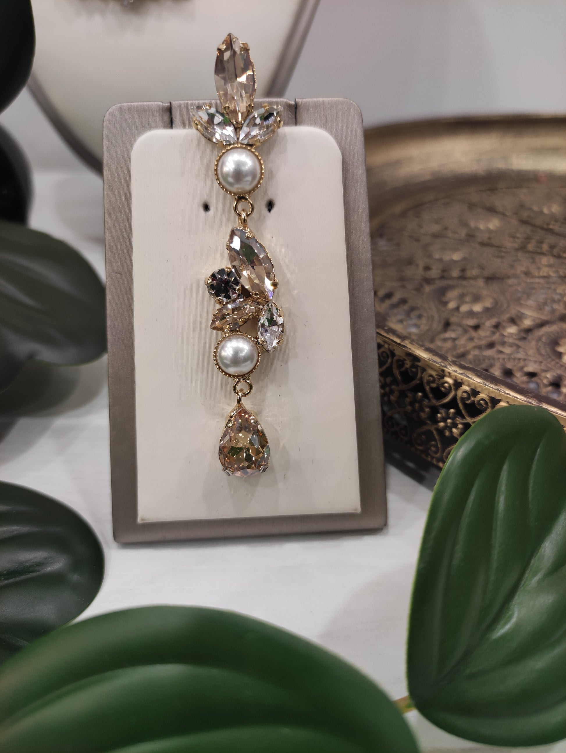 Orecchini pendenti realizzati in ottone placcato oro o argento con lega in stagno, impreziositi da strass e pietre Swarovski e perle, galvanica nickel free.