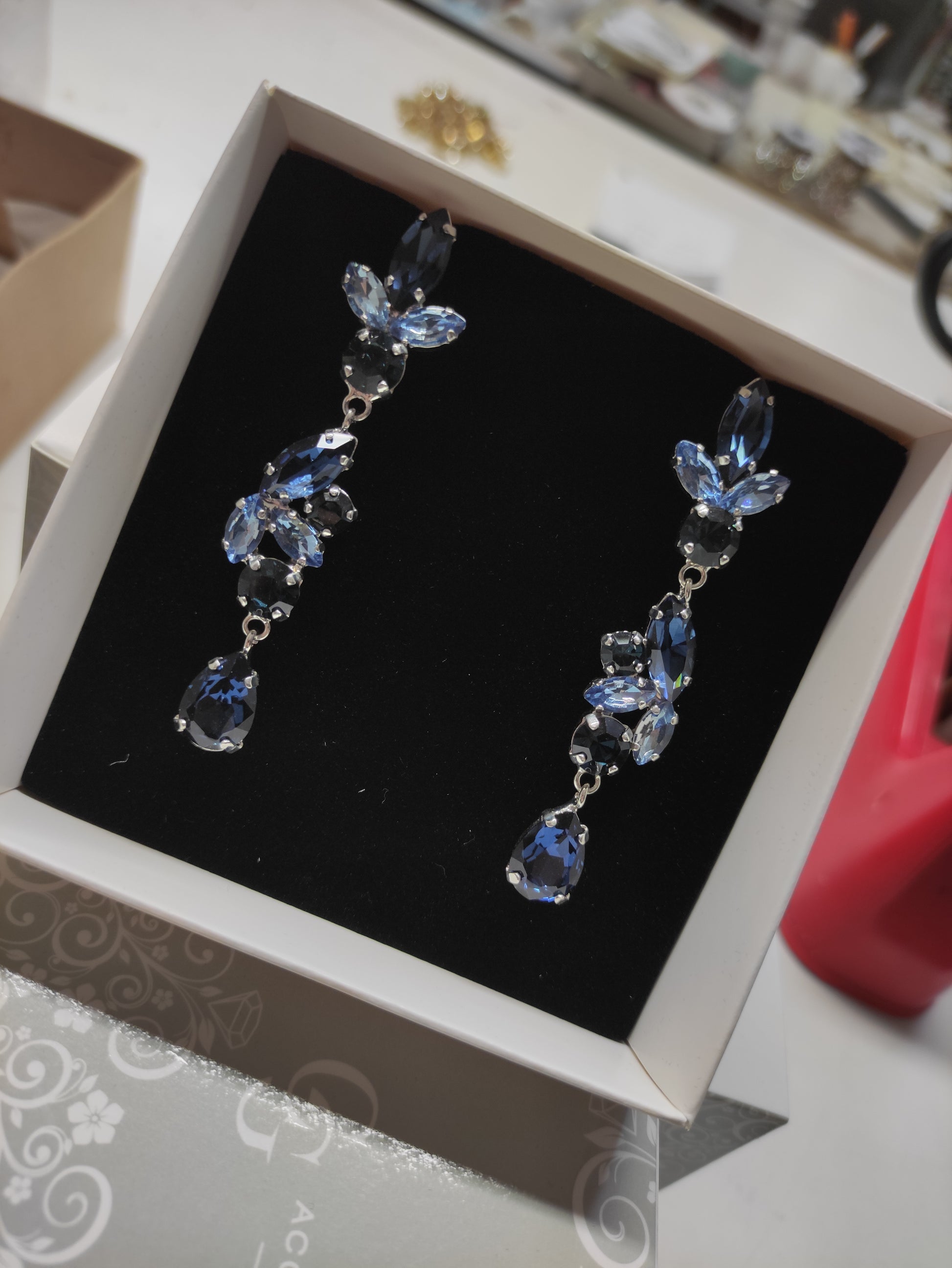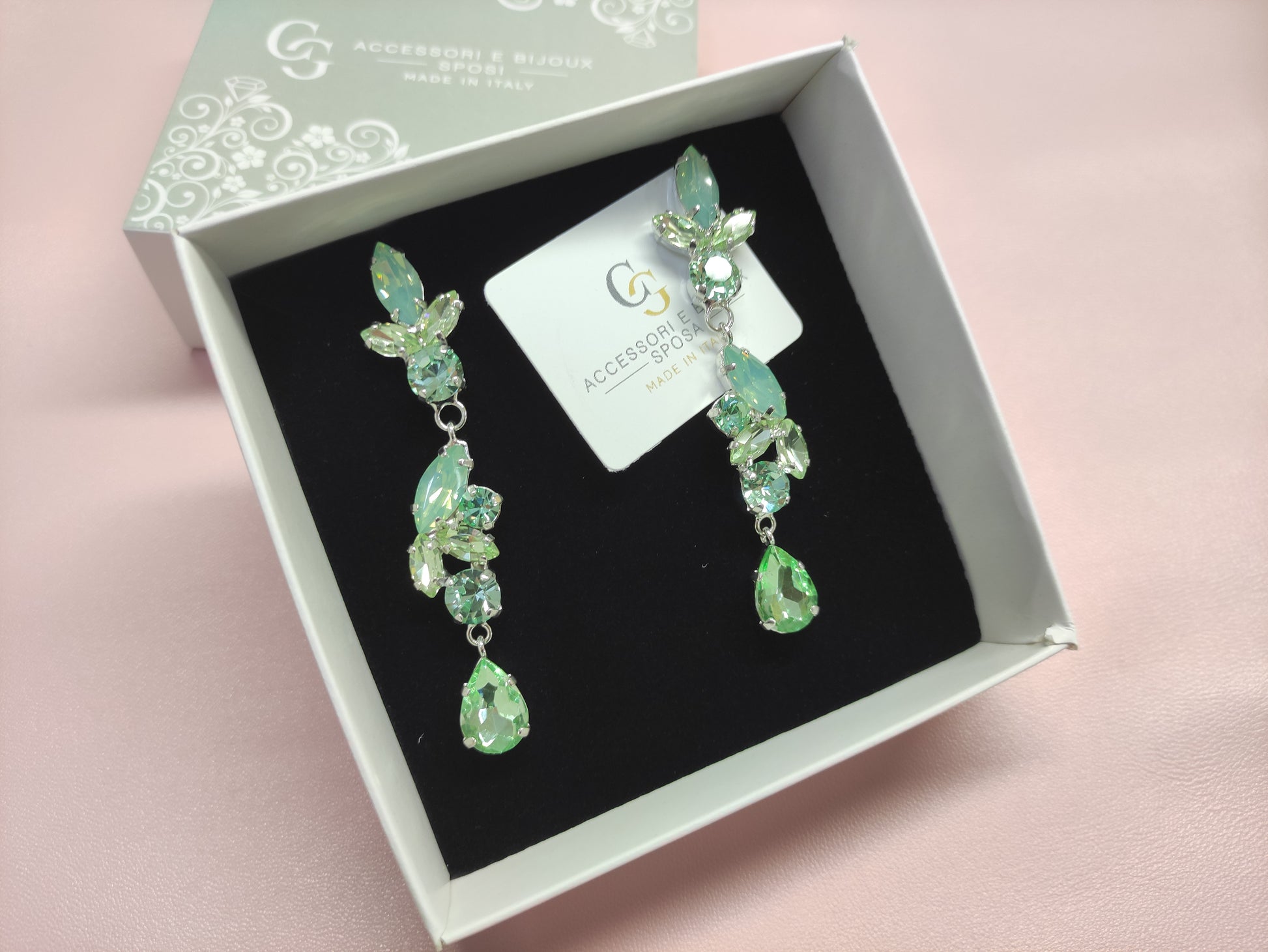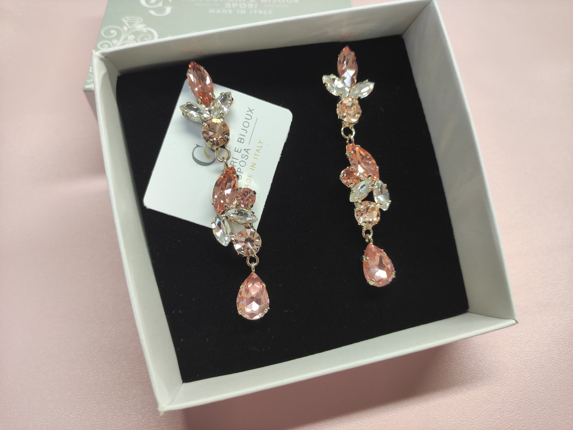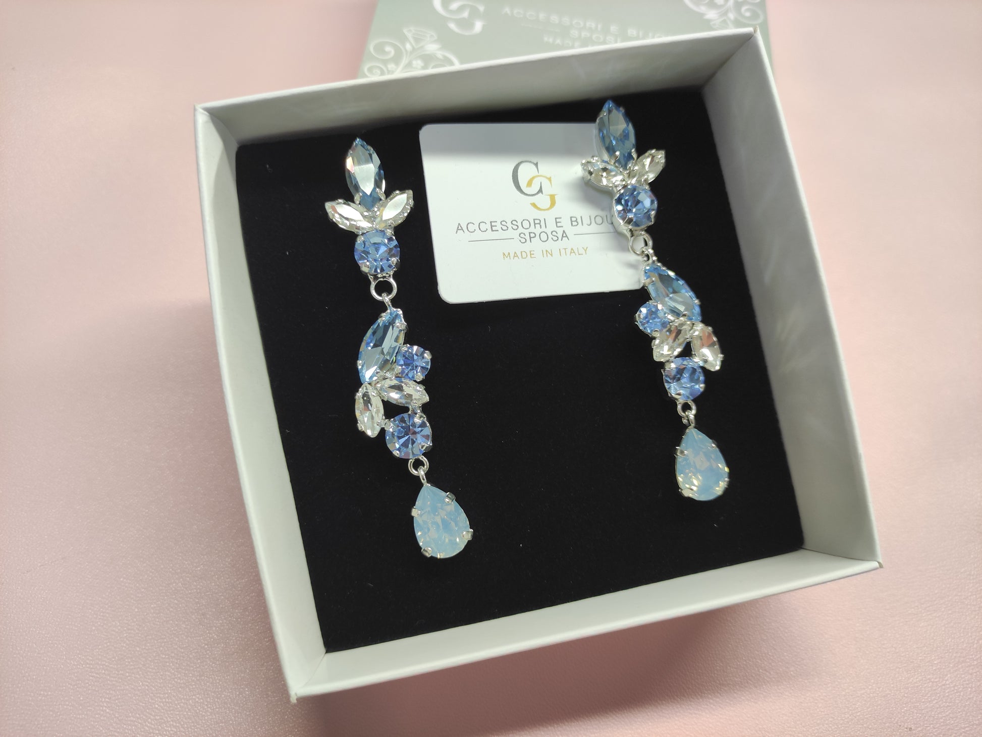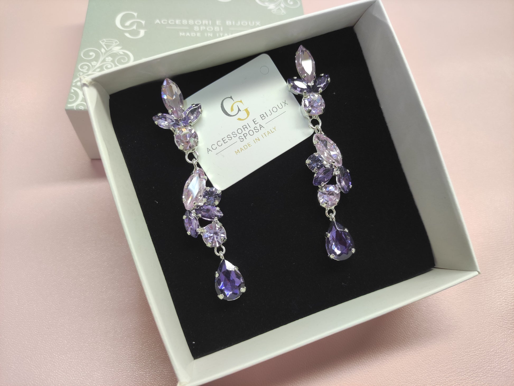 Orecchini pendenti realizzati in ottone placcato oro o argento con lega in stagno, impreziositi da strass e pietre Swarovski e perle, galvanica nickel free.