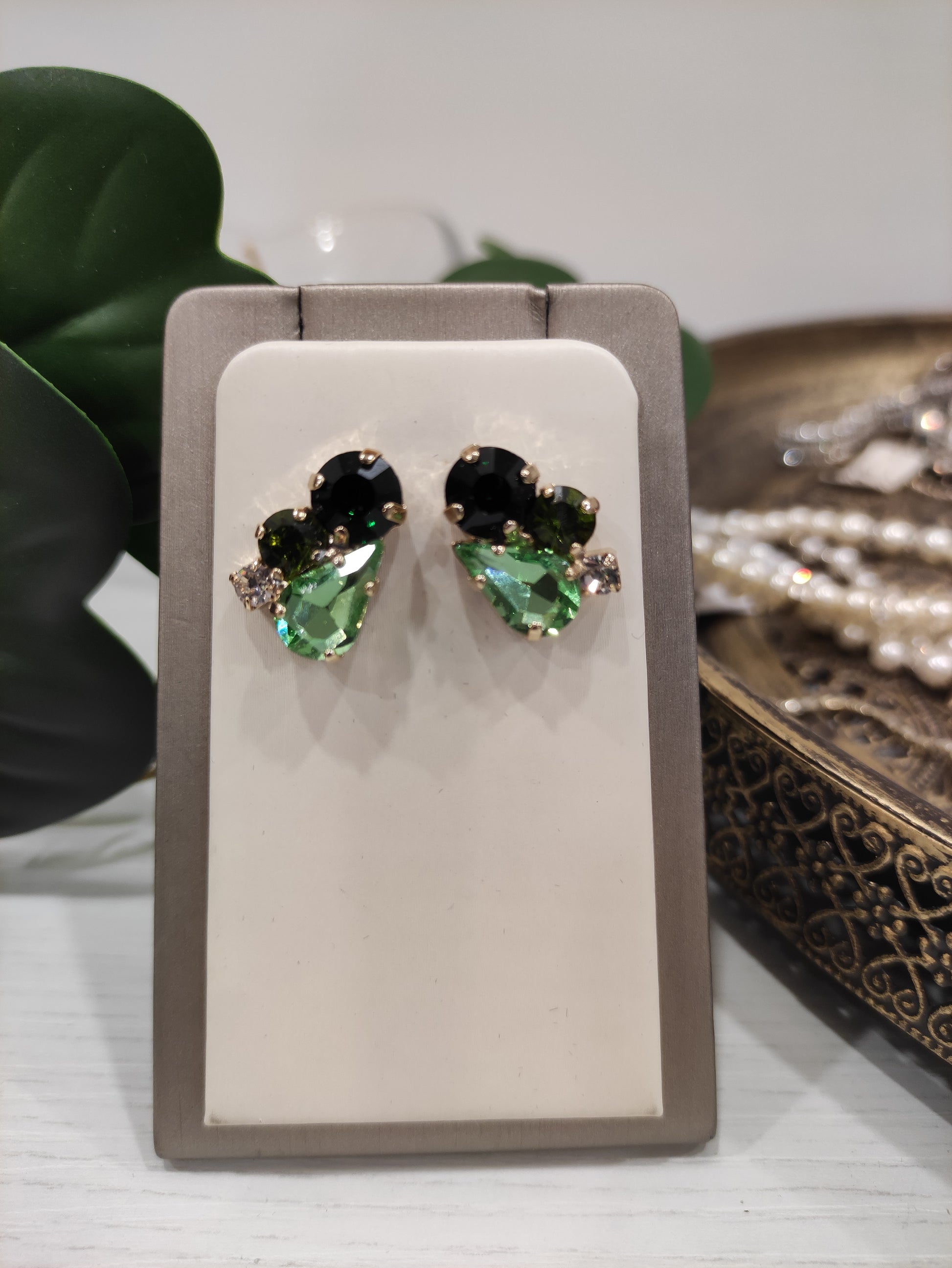 Orecchini al lobo realizzati in ottone placcato oro o argento con lega in stagno, arricchiti da strass e pietre castonate Swarovski, galvanica nickel free.