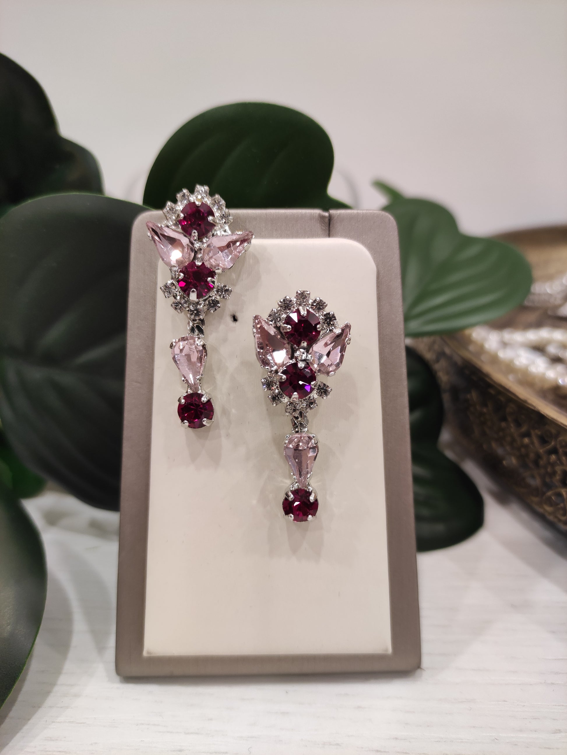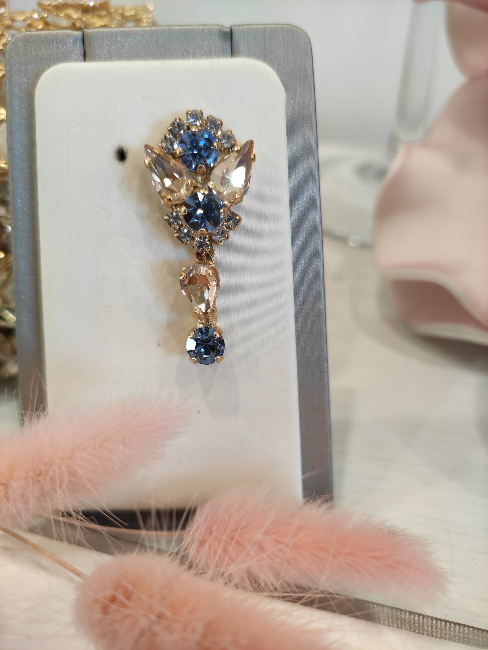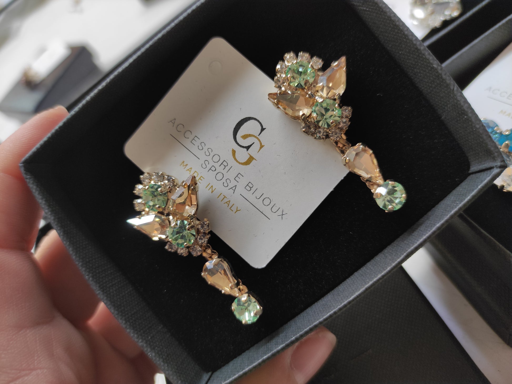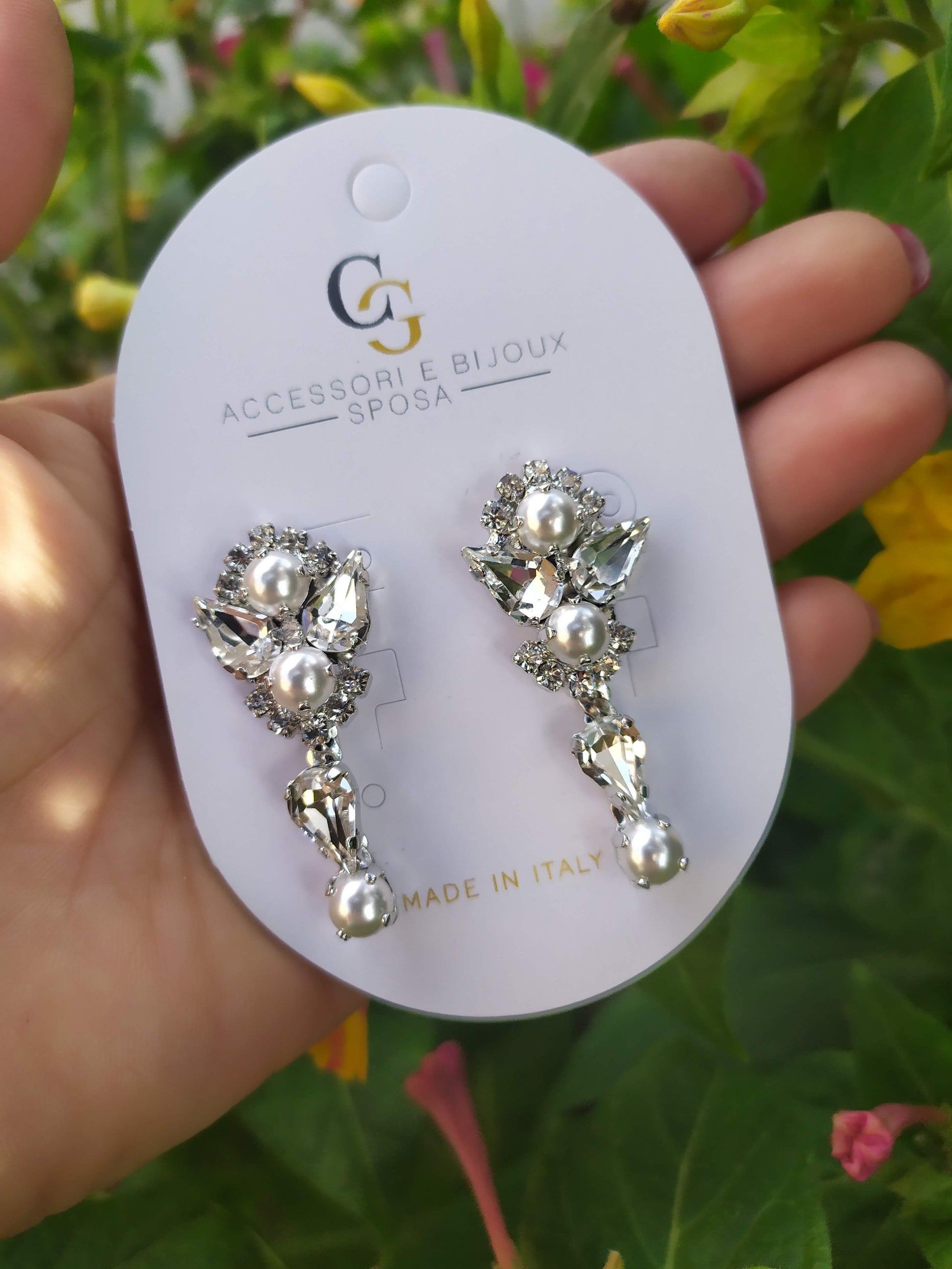 Orecchini pendenti realizzati in ottone placcato oro o argento con lega in stagno, impreziositi da strass e pietre Swarovski, galvanica nickel free.