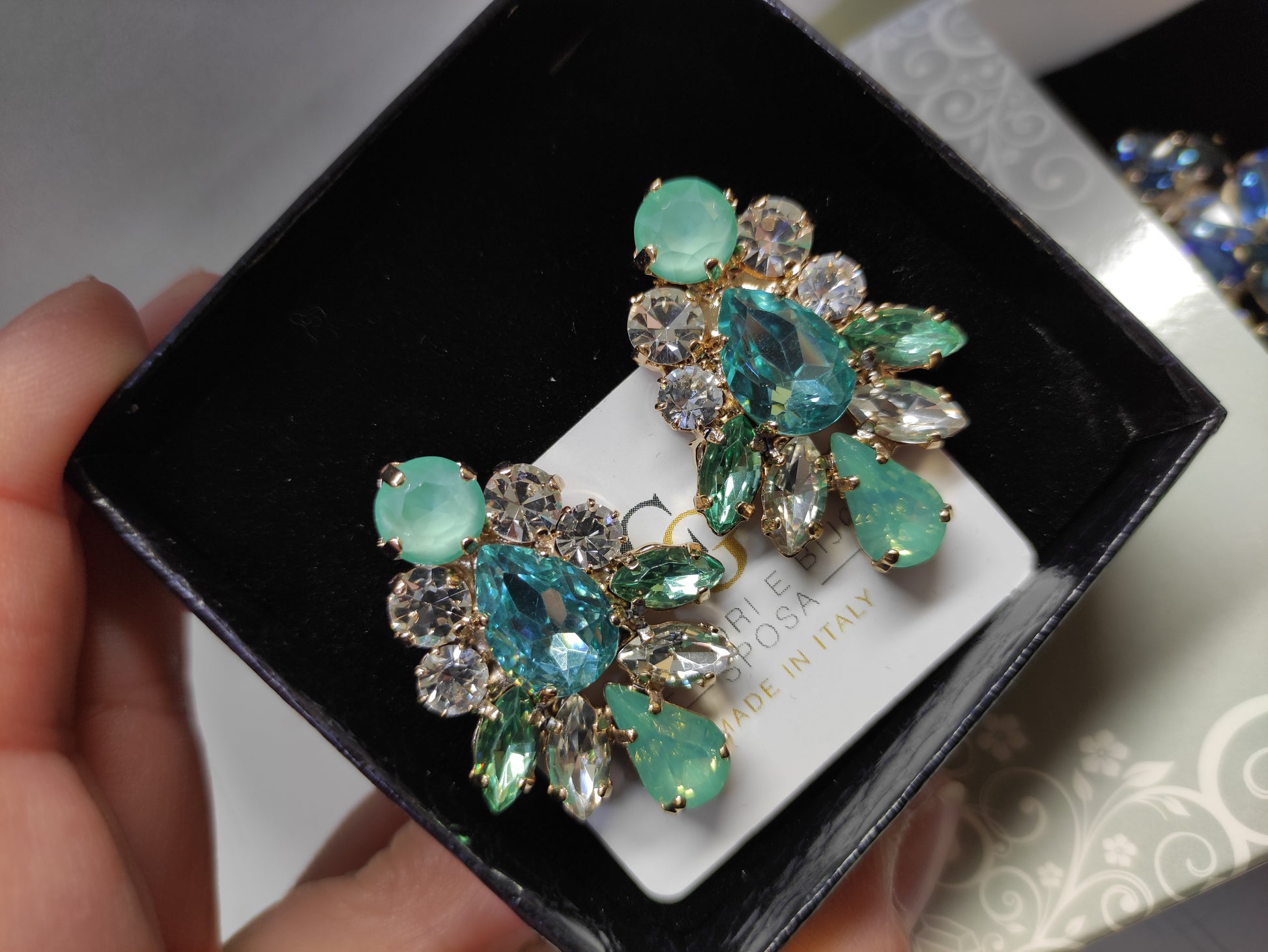 Orecchini realizzati in ottone placcato oro o argento con lega in stagno, impreziositi da strass e pietre Swarovski, galvanica nickel free.