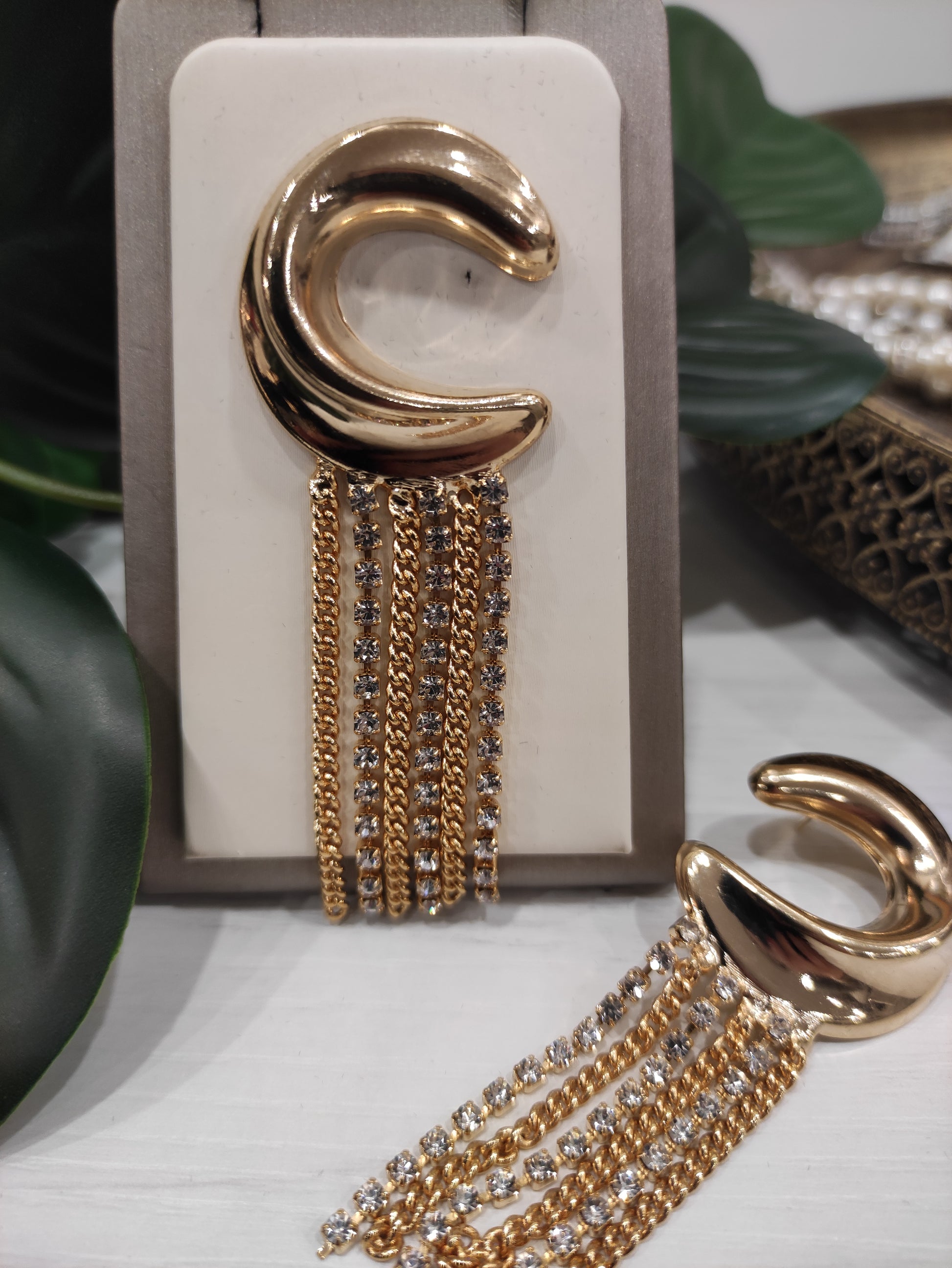 Orecchini realizzati in ottone placcato oro o argento con chandelier di strass Swarovski e catenine, galvanica nickel free.
