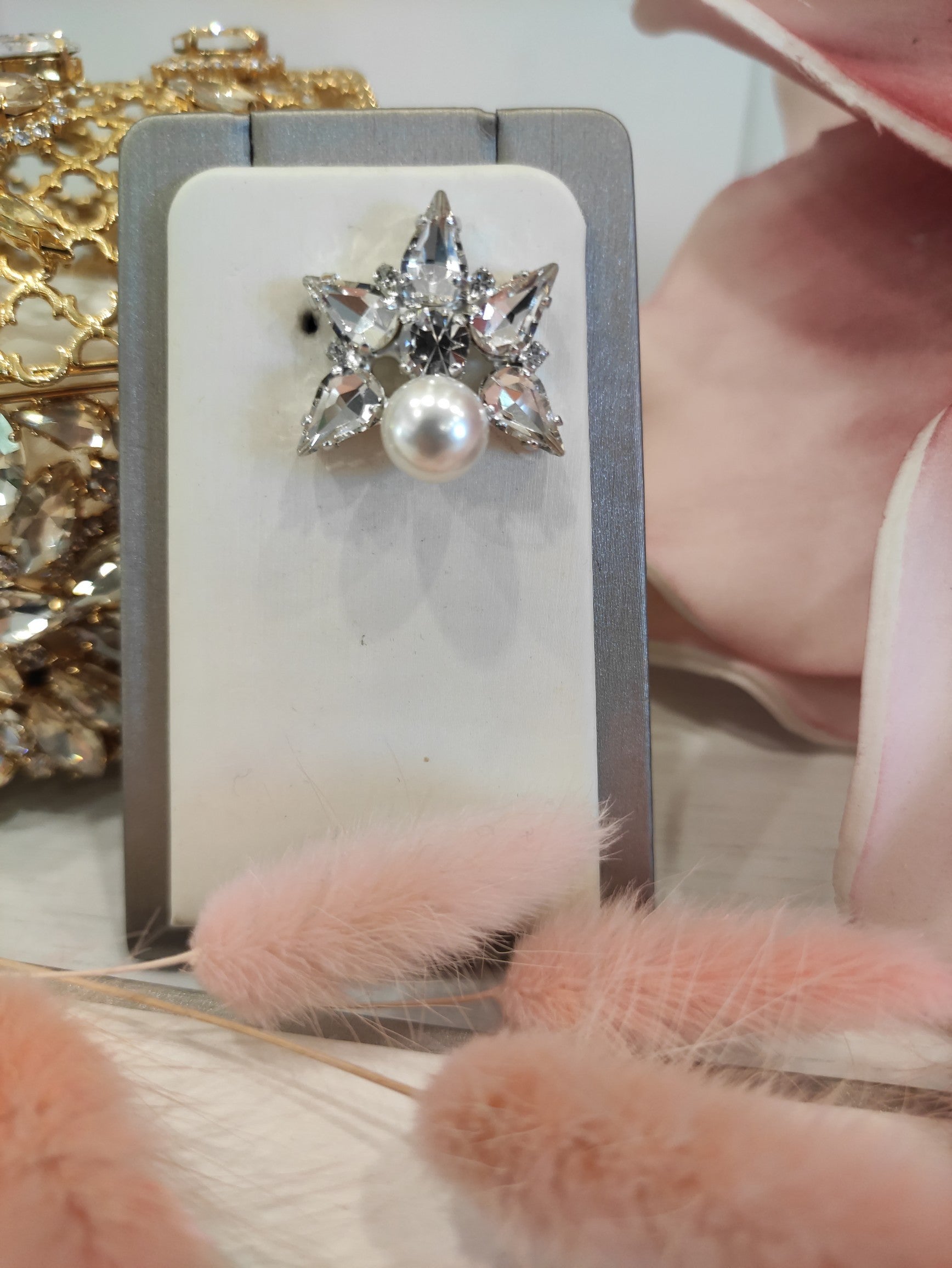 Orecchini realizzati in ottone placcato oro o argento con lega in stagno, arricchiti da strass e pietre Swarovski e perle, galvanica nickel free.