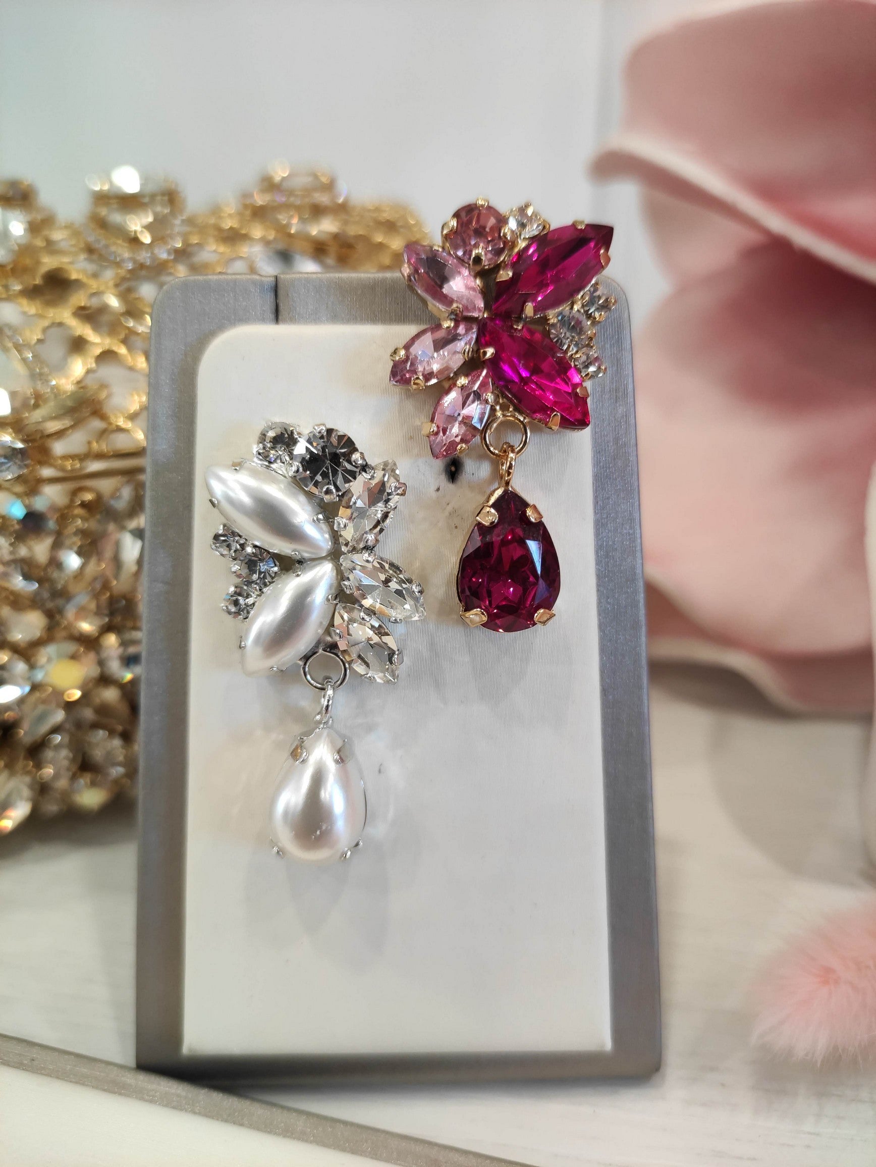 Orecchini con pendente realizzati in ottone placcato oro o argento con lega in stagno, arricchiti da strass e pietre Swarovski, galvanica nickel free.