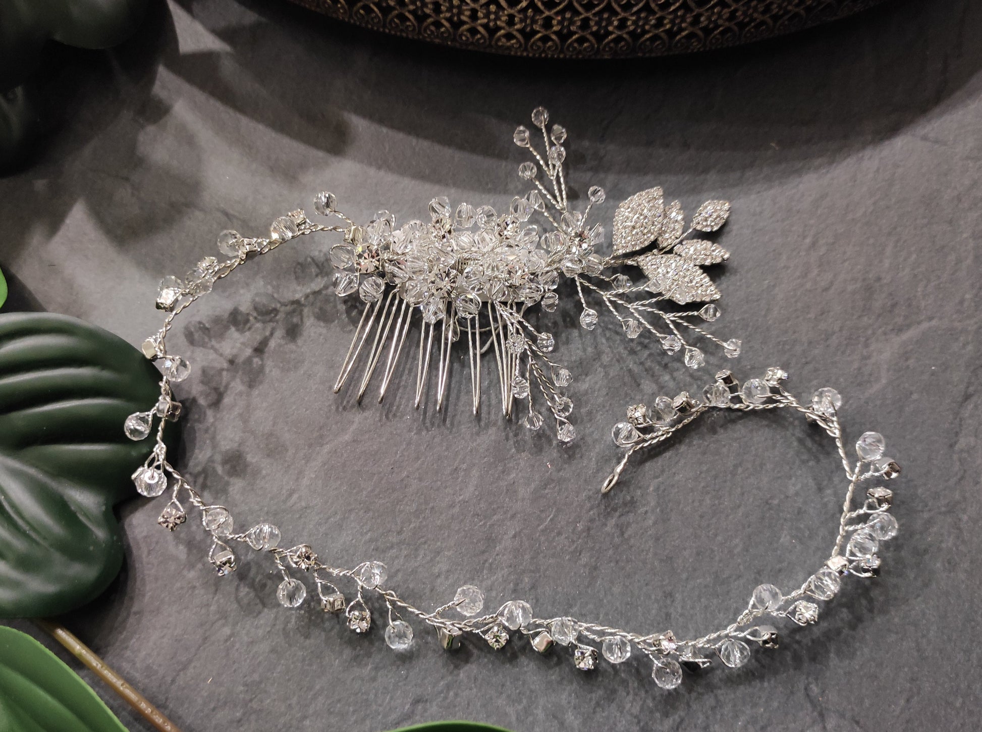 Pettinino bijoux da sposa, conristalli e foglioline in strass swarovski, con aggiunta di filo bijoux modellabile, fatto a mano, made in Italy, personalizzabile.