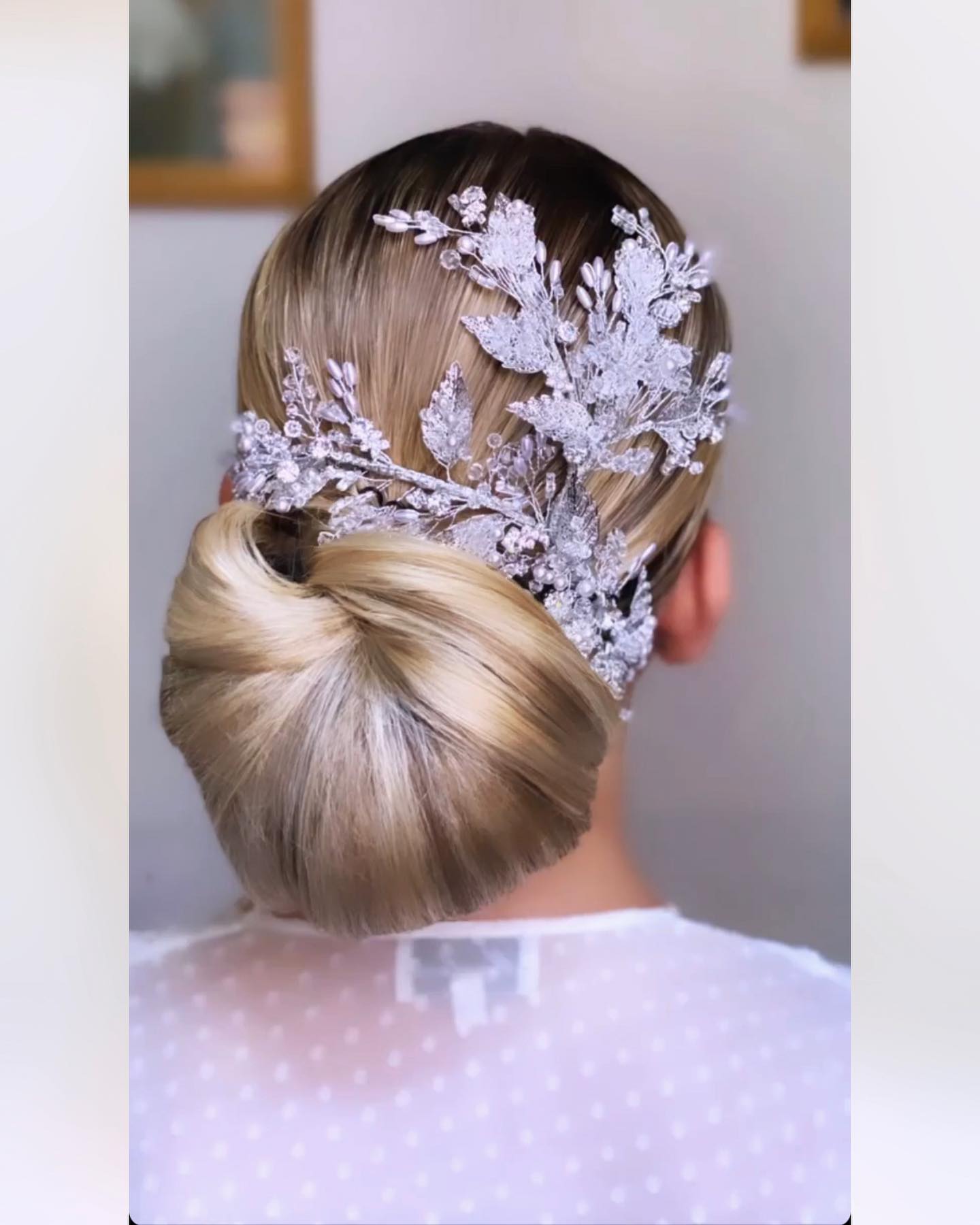 Accessorio bijoux con pistilli in materiali swarovski e foglioline filigranate, i due rami sono modellabili, fatto a mano, made in italy, personalizzabile.