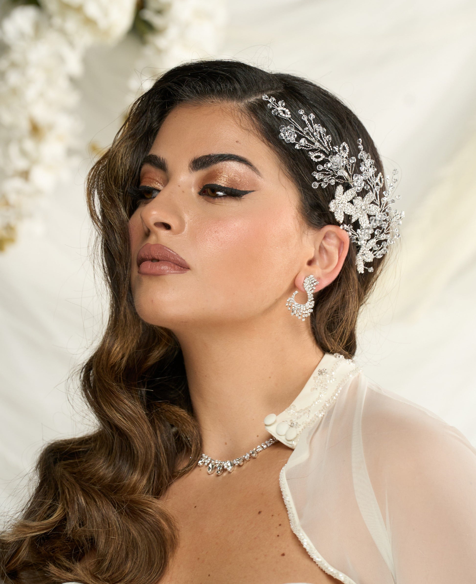 Pettinino bijoux da sposa, lavorazione con pistilli con perle e cristalli e fiori in strass swarovski, fatto a mano, made in Italy, personalizzabile.