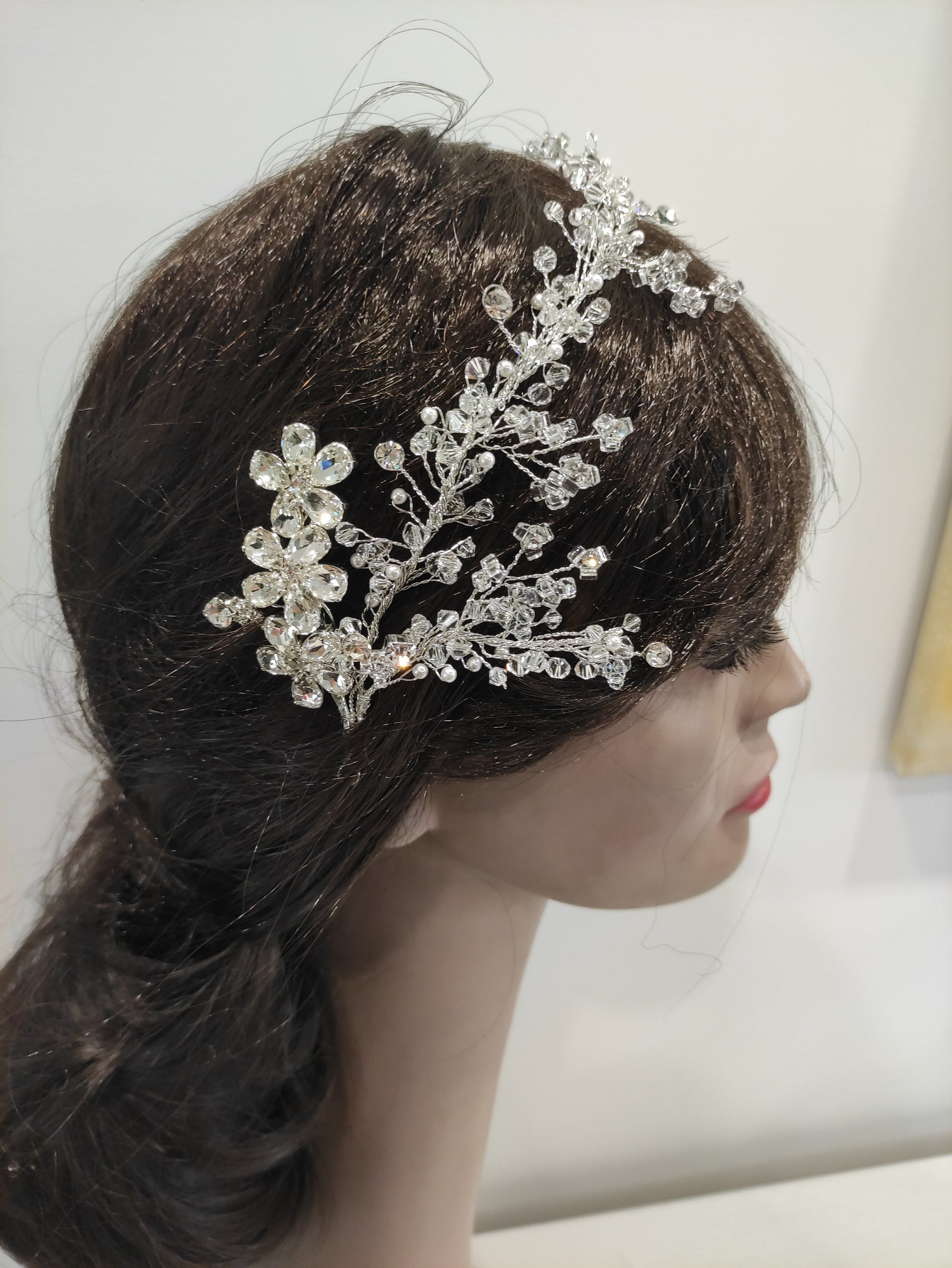 Accessorio bijoux modellabile con lavorazione ad intreccio di cristalli, conterie e strass swarovski e impreziosito da due fiori di pietre castonate, fatto a mano, made in italy, personalizzabile.
