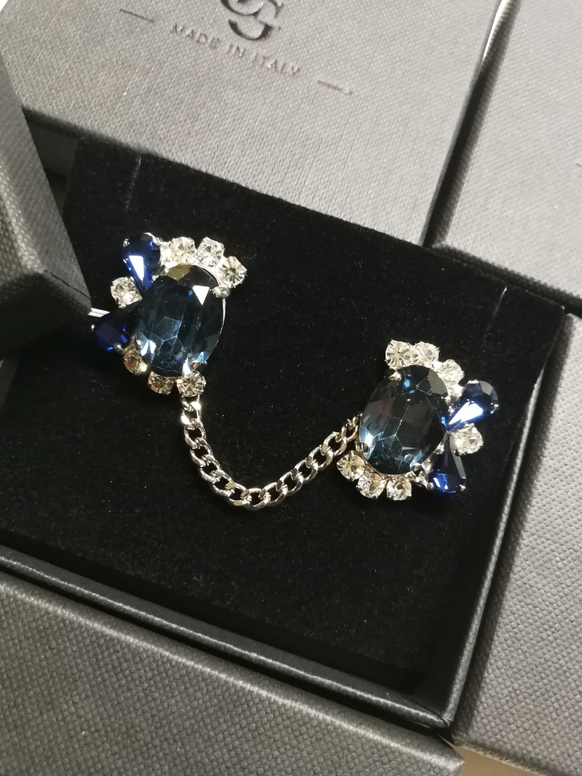 Coppia di bottoni bijoux per impreziosire giacca con doppia asola, collegati con catenina e forniti di fermo sul retro.