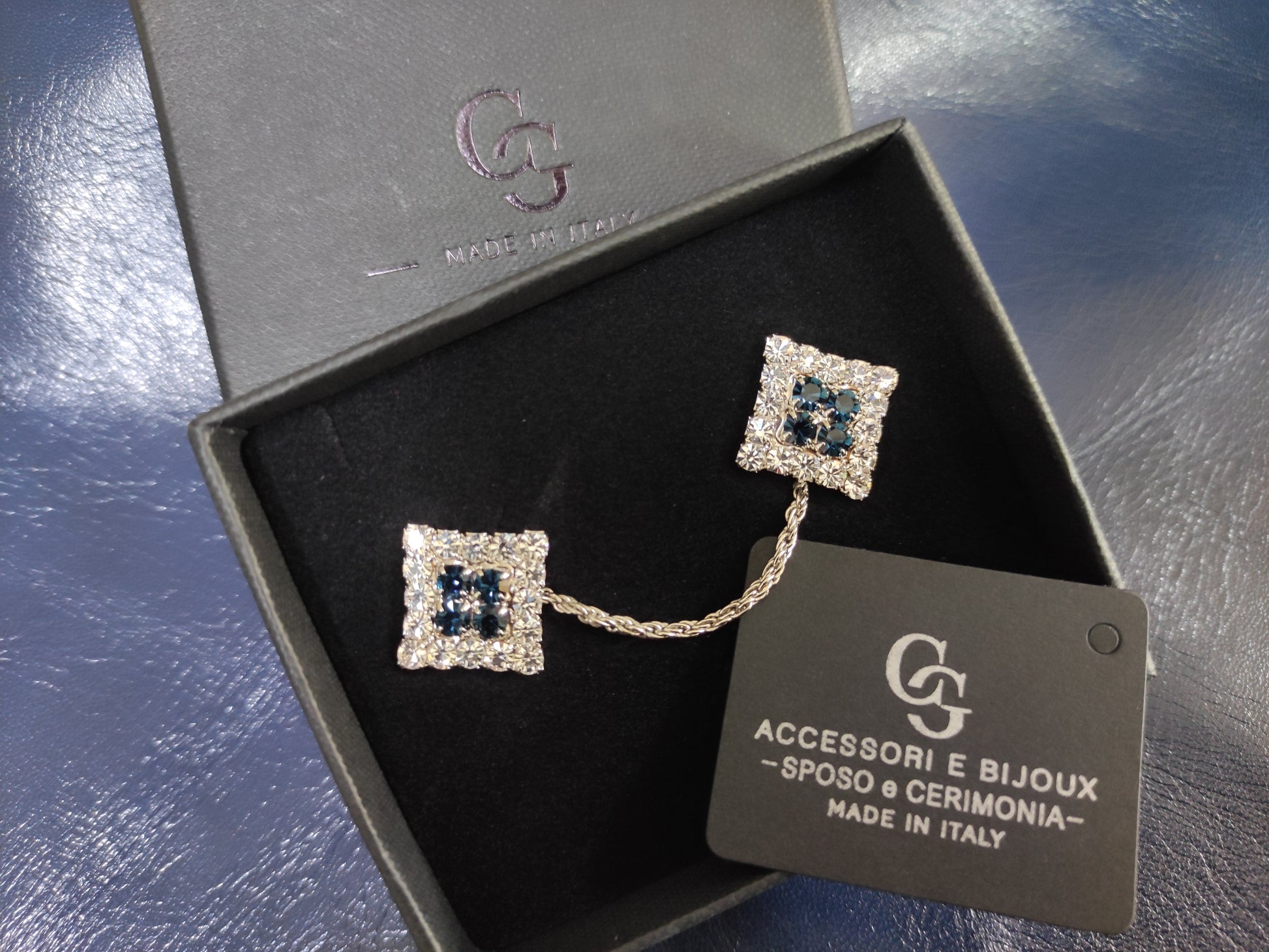 Coppia di bottoni bijoux per impreziosire giacca con doppia asola, collegati con catenina e forniti di fermo sul retro.
