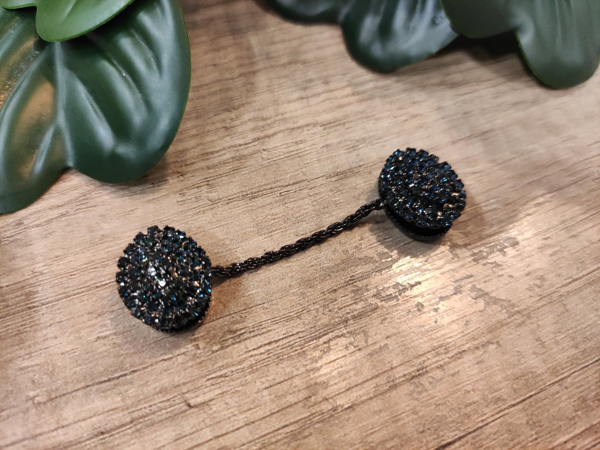 Coppia di bottoni bijoux per impreziosire giacca con doppia asola, collegati con catenina e forniti di fermo sul retro.
