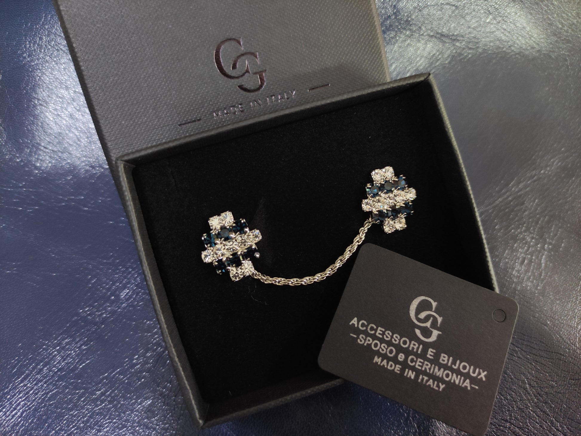 Coppia di bottoni bijoux per impreziosire giacca con doppia asola, collegati con catenina e forniti di fermo sul retro.