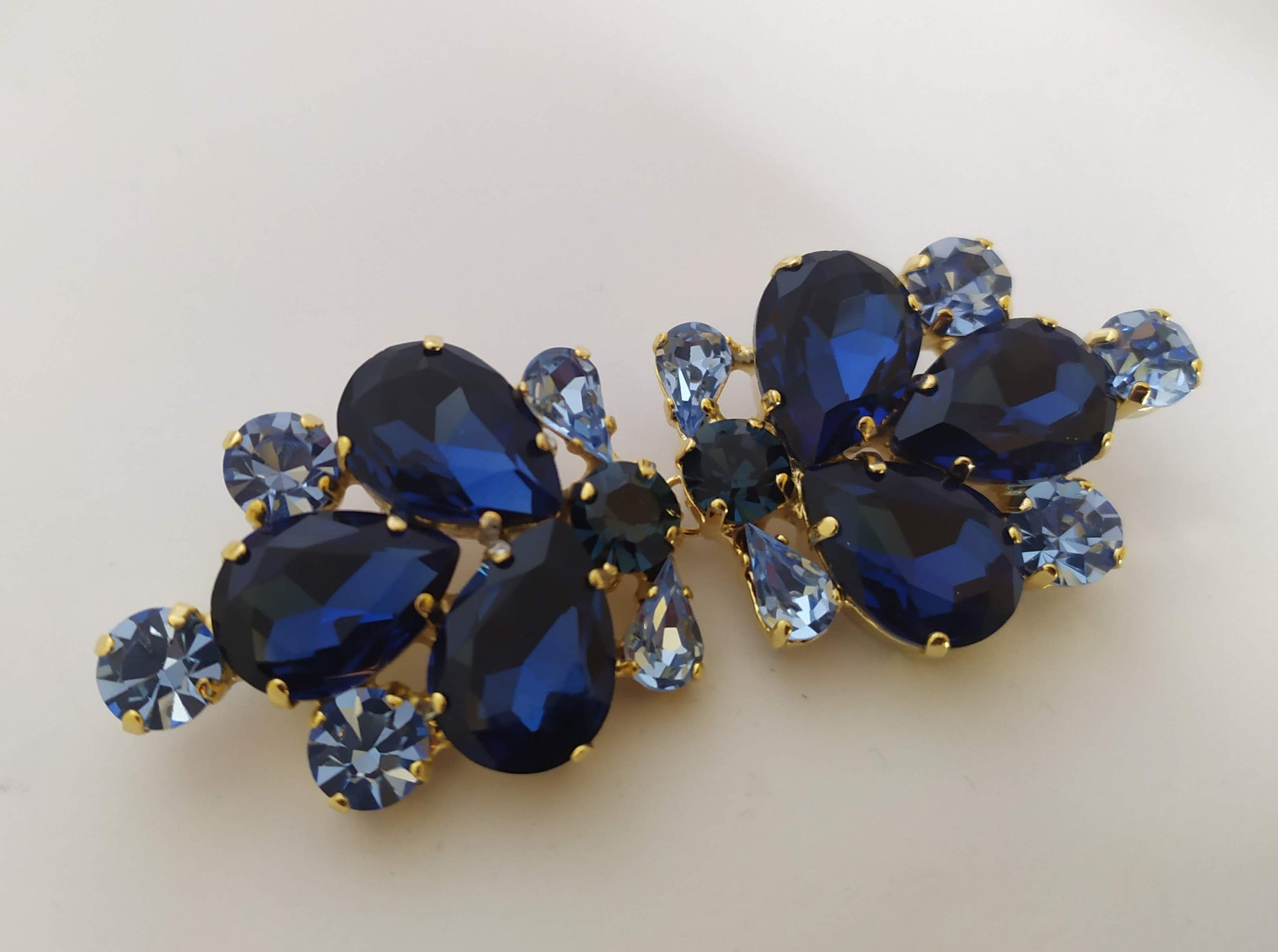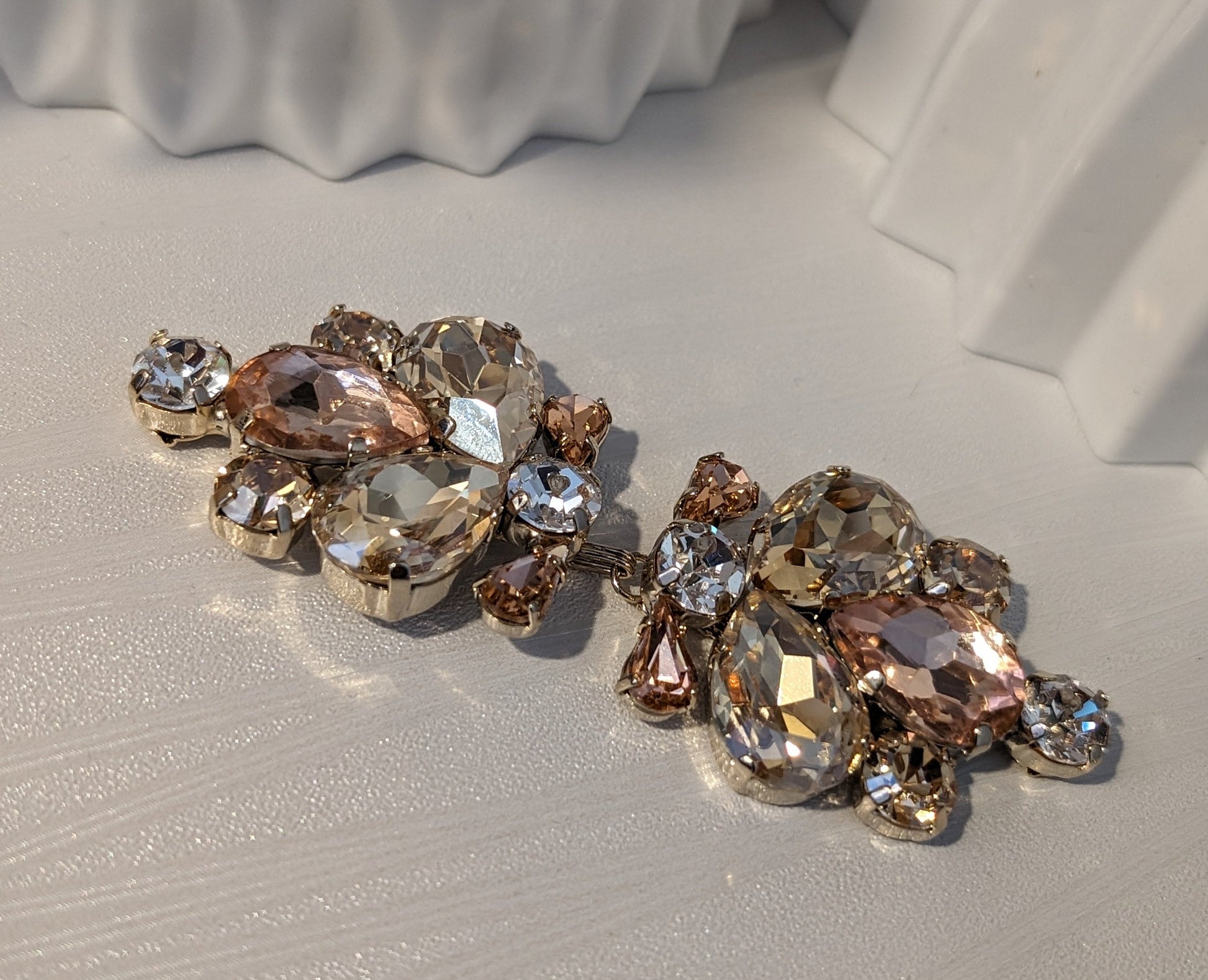 Chiusura ad alamaro bijoux, da applicare su giacche. Lavorazione con pietre e strass Swarovski e Preciosa, anelli per cucitura e gancetti. Lega in stagno e galvanica nichel free.