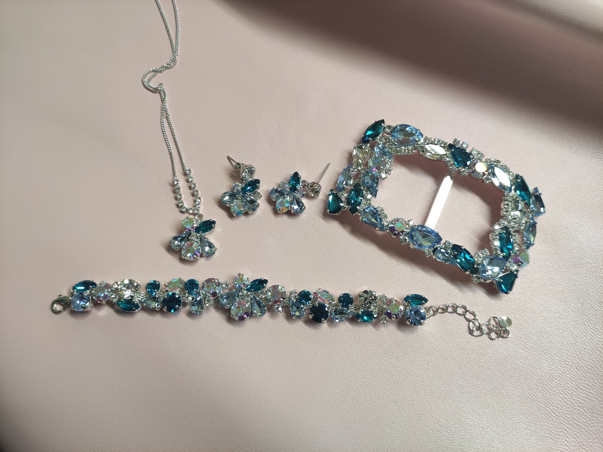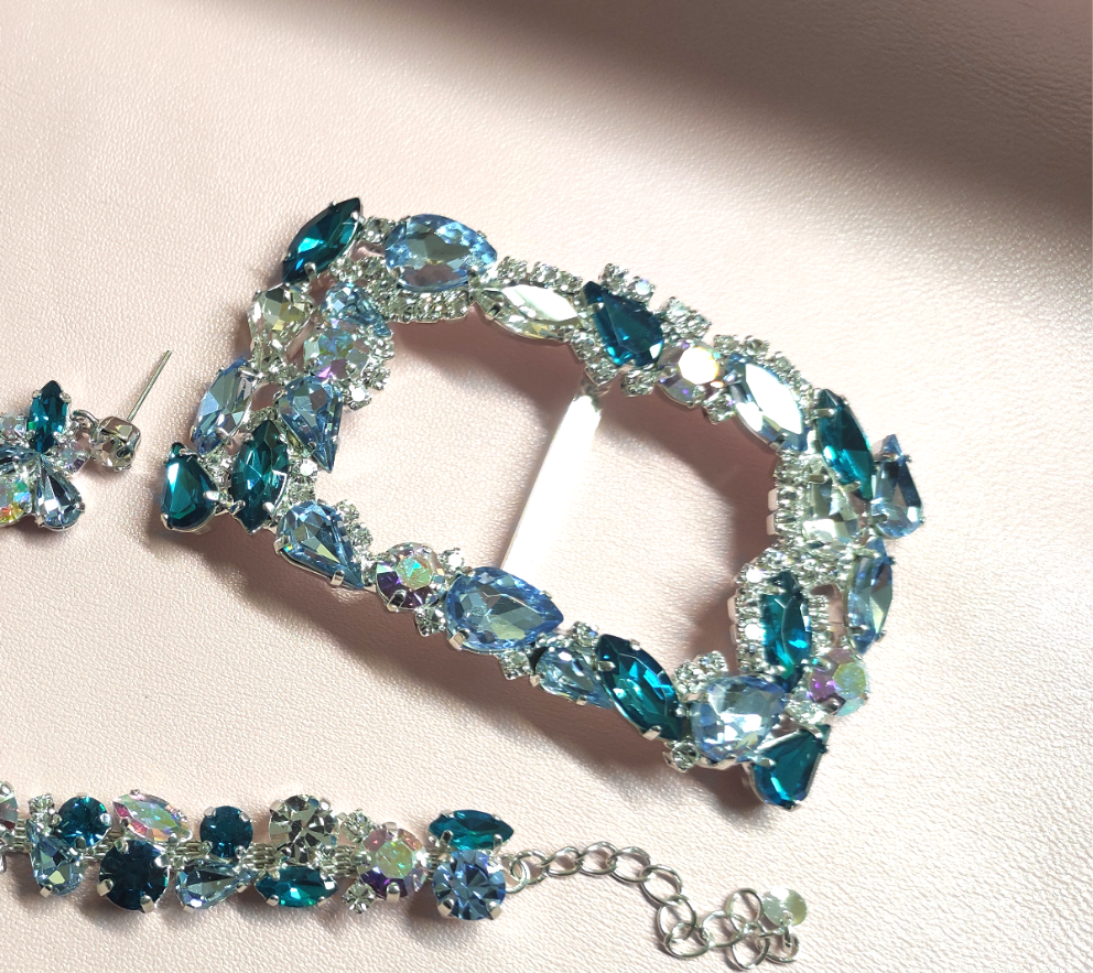 Fibbia bijoux con passante, da applicare su cinture in tessuto. Lavorazione con pietre e strass Swarovski e Preciosa, con lega in stagno e galvanica nichel free.