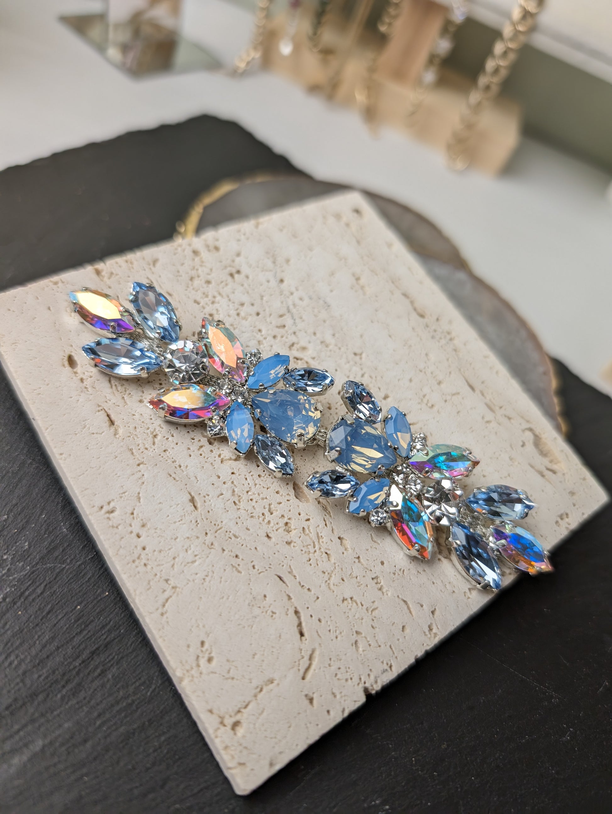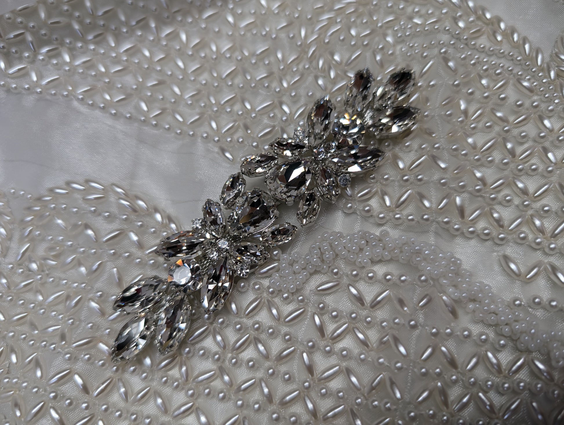 Accessorio bijoux, da applicare su cinture in tessuto. Lavorazione con pietre e strass Swarovski e Preciosa, con lega in stagno e galvanica nichel free.