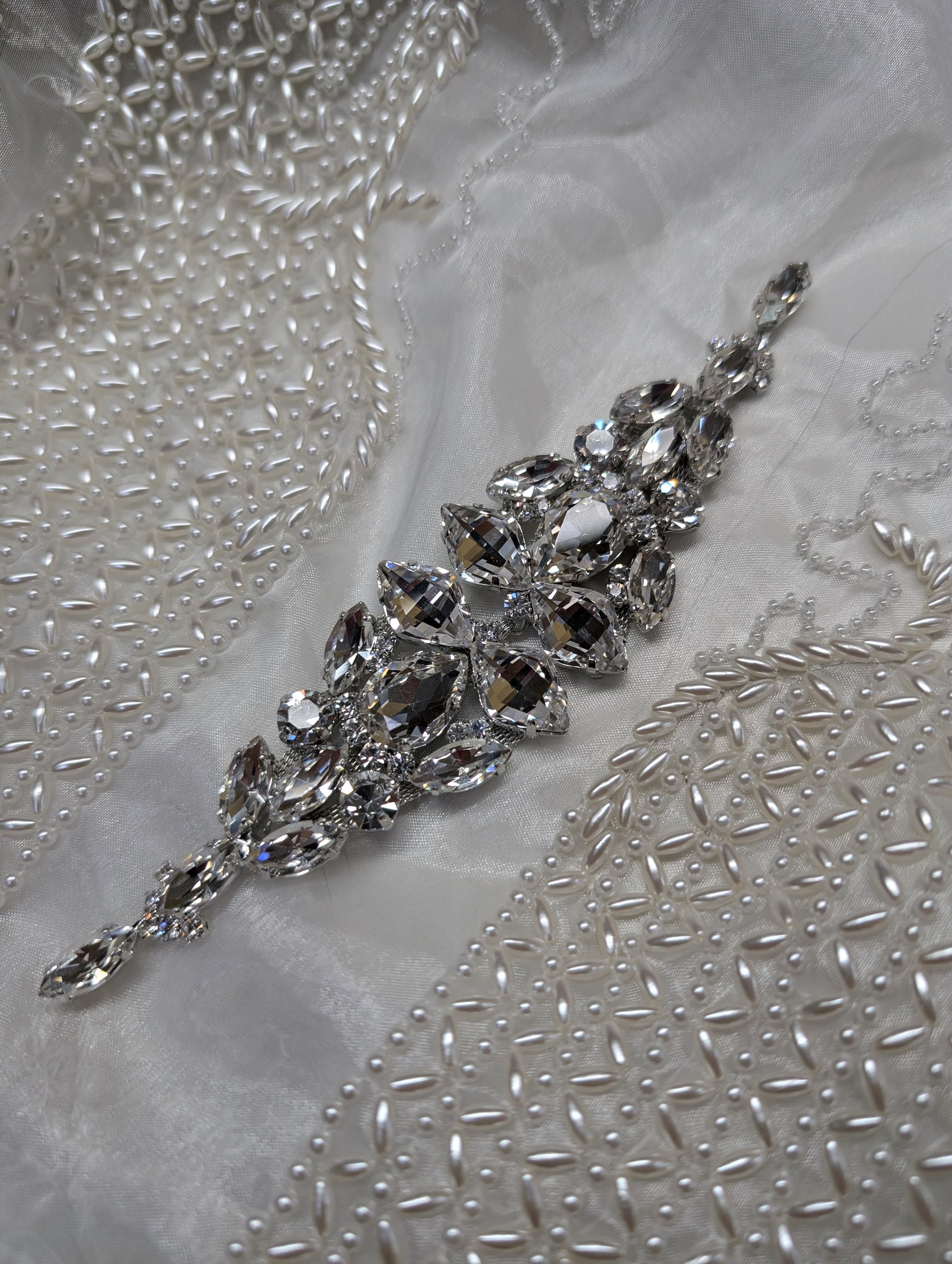 Accessorio bijoux, da applicare su cinture in tessuto. Lavorazione con pietre e strass Swarovski e Preciosa, con lega in stagno e galvanica nichel free.