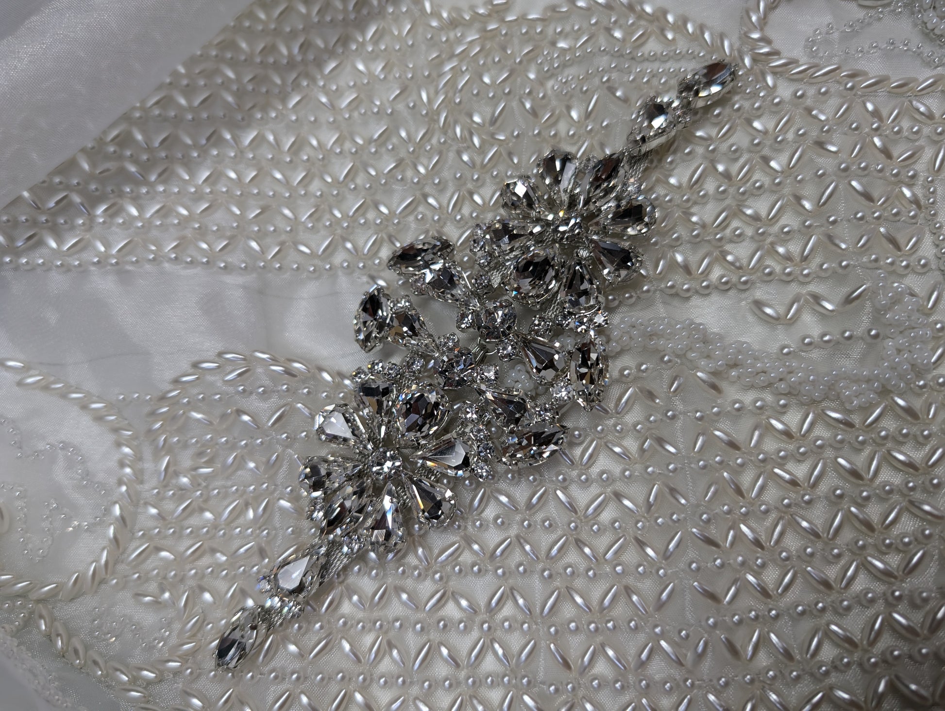 Accessorio bijoux, da applicare su cinture in tessuto. Lavorazione con pietre e strass Swarovski e Preciosa, con lega in stagno e galvanica nichel free.