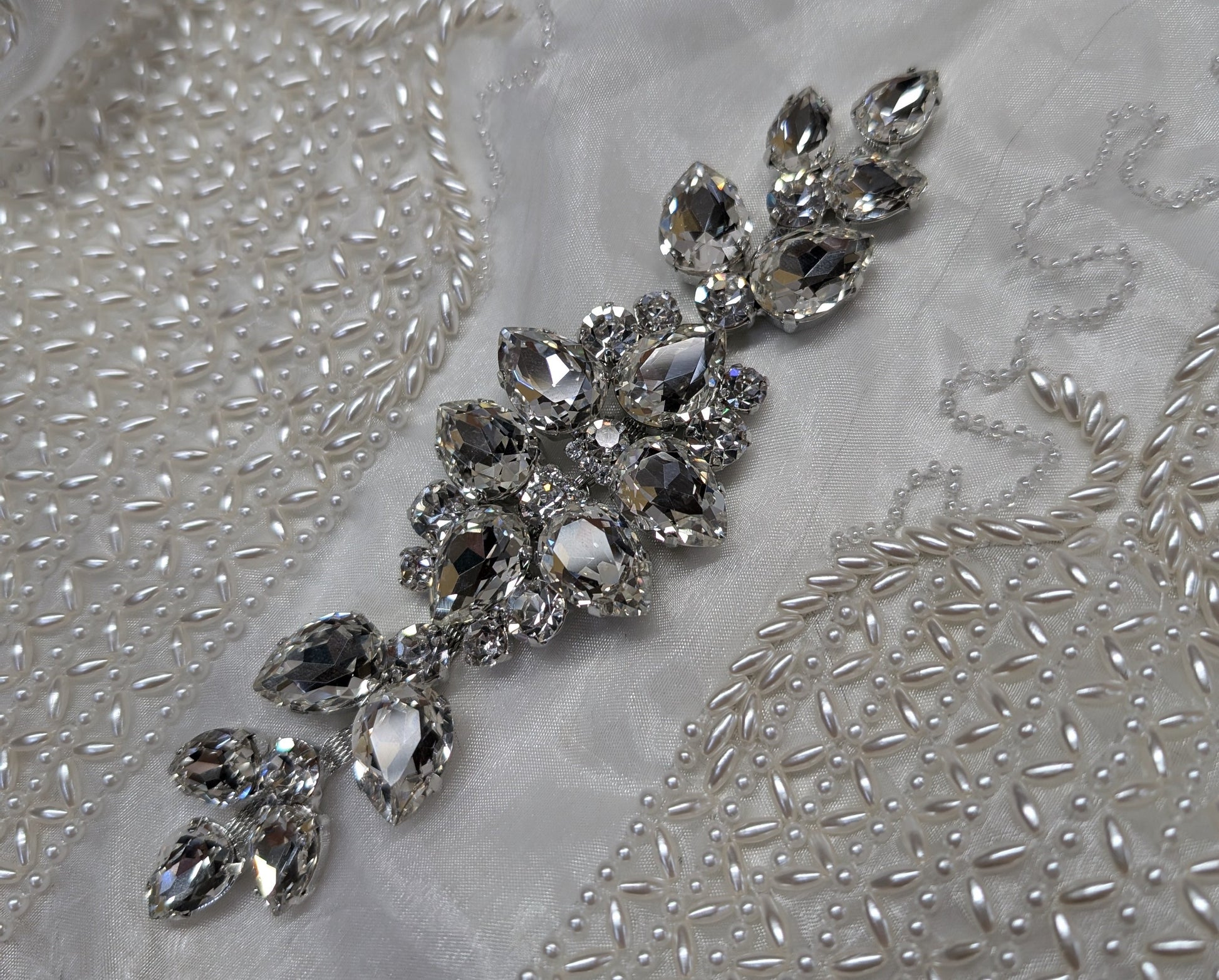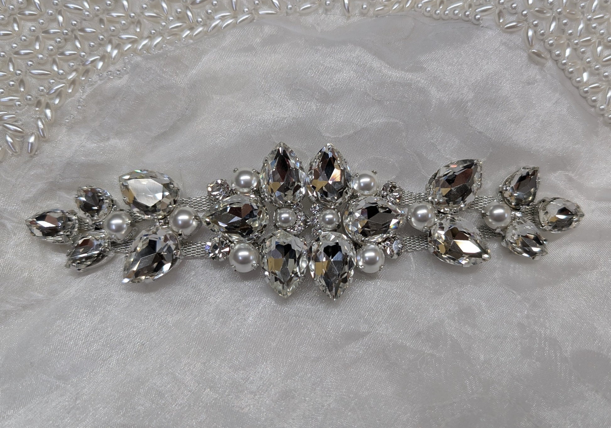 Accessorio bijoux, da applicare su cinture in tessuto. Lavorazione con pietre e strass Swarovski e Preciosa, con lega in stagno e galvanica nichel free.
