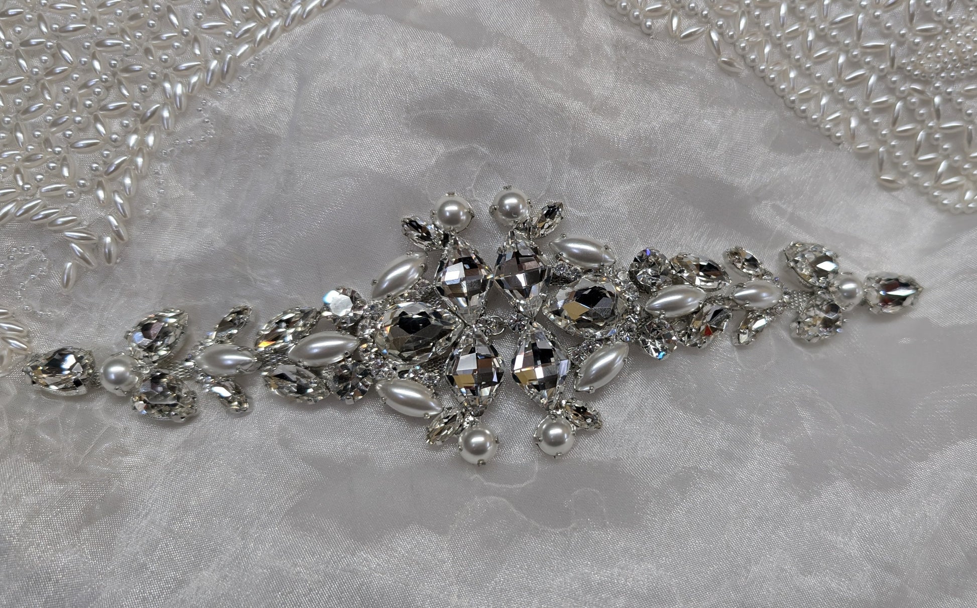 Accessorio bijoux, da applicare su cinture in tessuto. Lavorazione con pietre e strass Swarovski e Preciosa, con lega in stagno e galvanica nichel free.