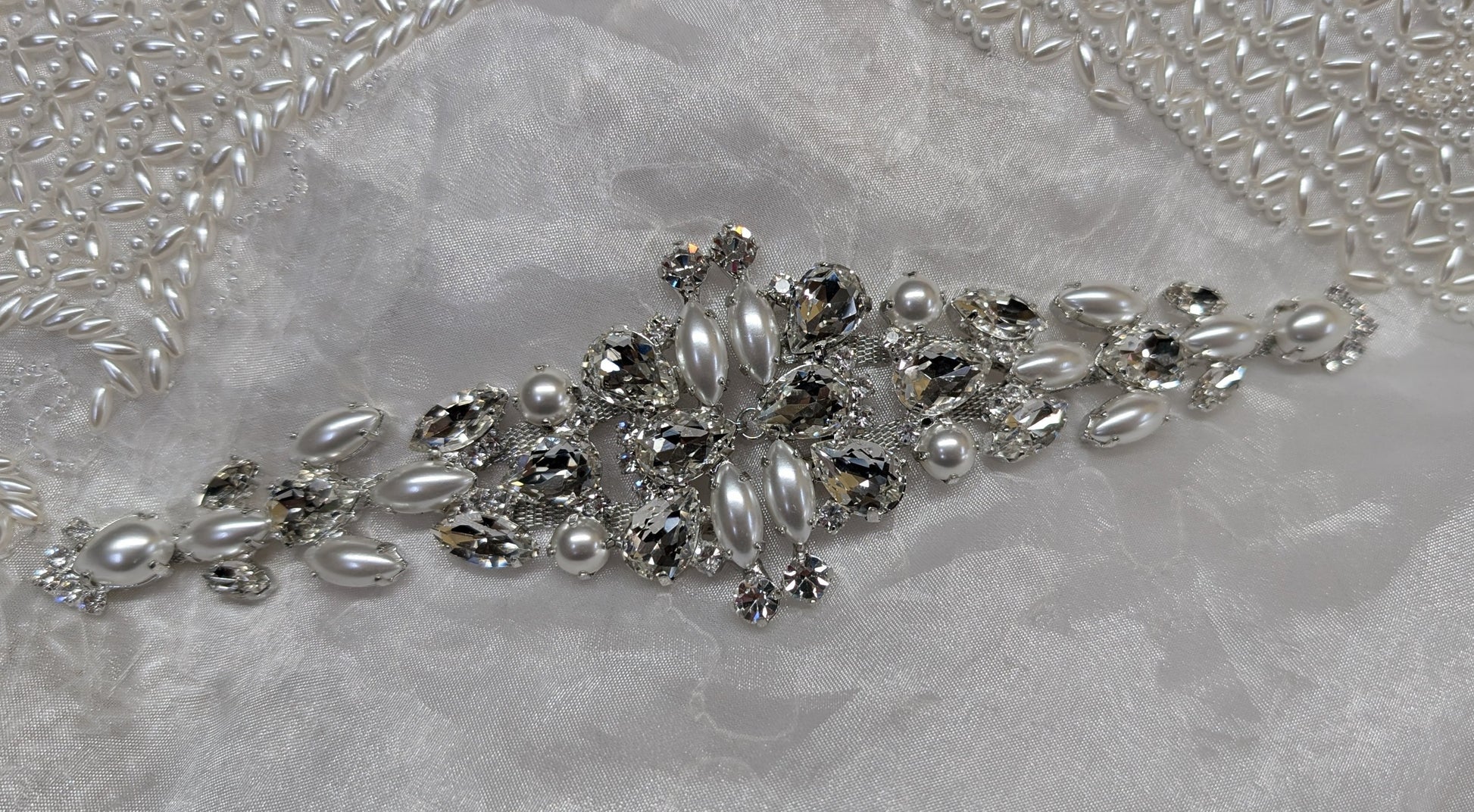 Accessorio bijoux, da applicare su cinture in tessuto. Lavorazione con pietre e strass Swarovski e Preciosa, con lega in stagno e galvanica nichel free.