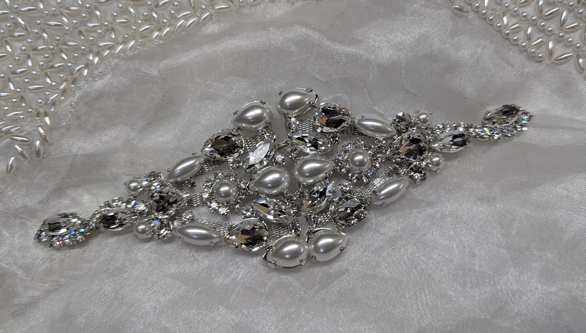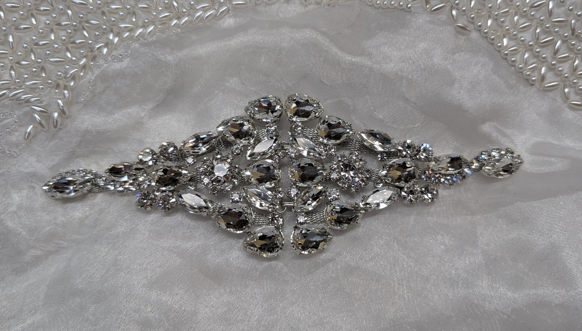 Accessorio bijoux, da applicare su cinture in tessuto. Lavorazione con pietre e strass Swarovski e Preciosa, con lega in stagno e galvanica nichel free.