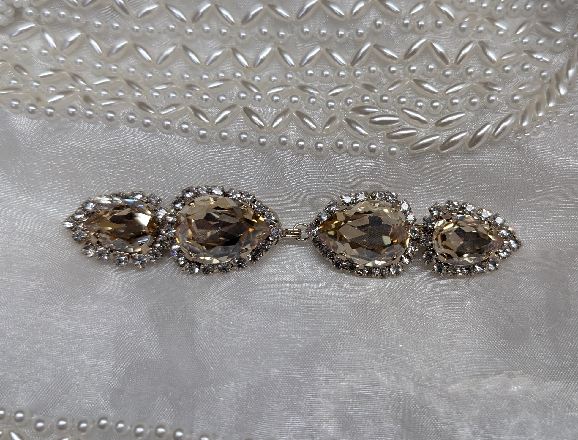 Accessorio bijoux, da applicare su cinture in tessuto. Lavorazione con pietre e strass Swarovski e Preciosa, con lega in stagno e galvanica nichel free.