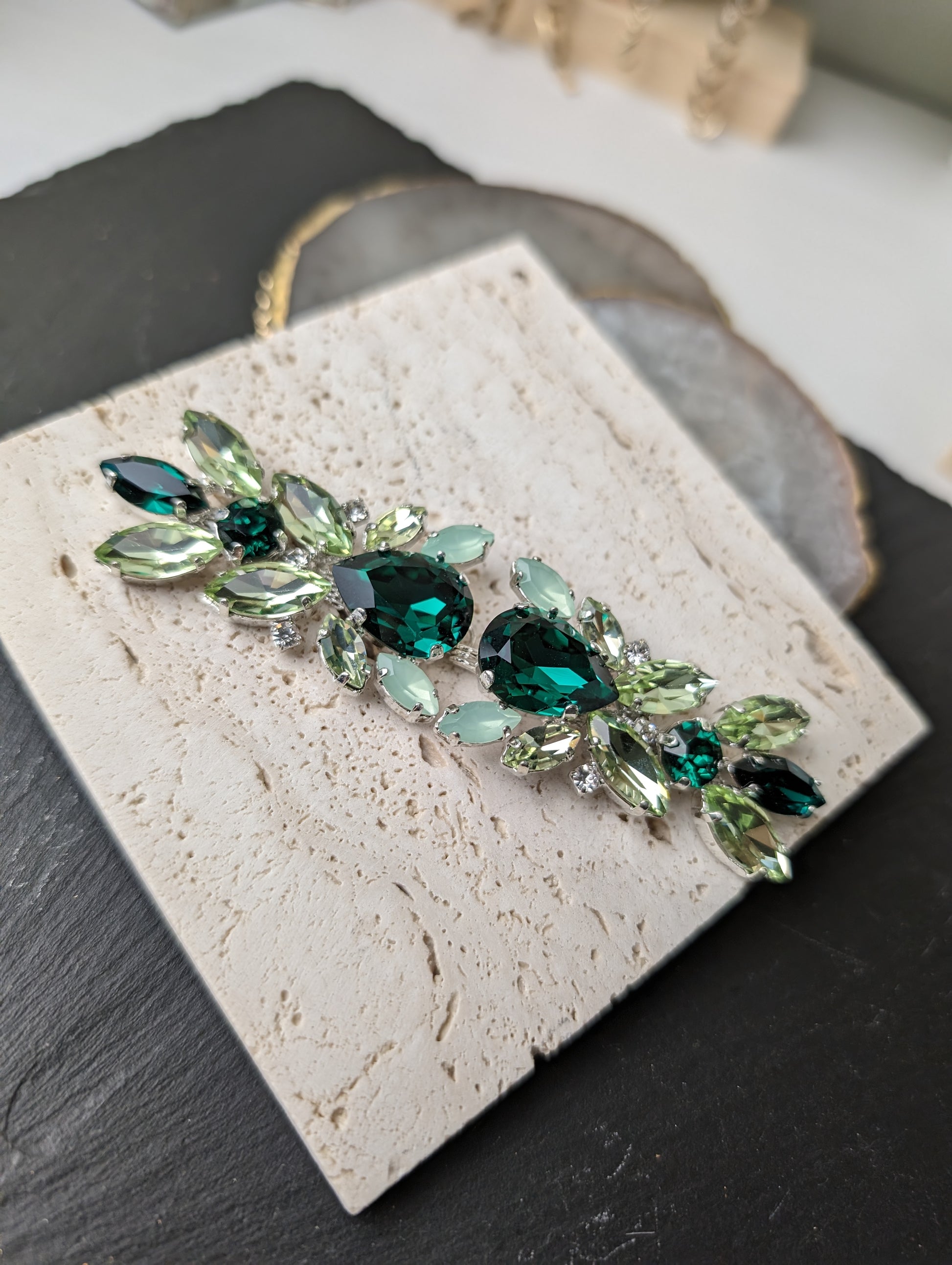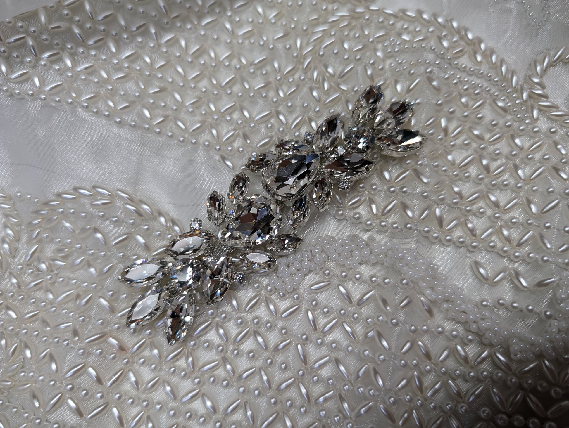 Accessorio bijoux, da applicare su cinture in tessuto. Lavorazione con pietre e strass Swarovski e Preciosa, con lega in stagno e galvanica nichel free.