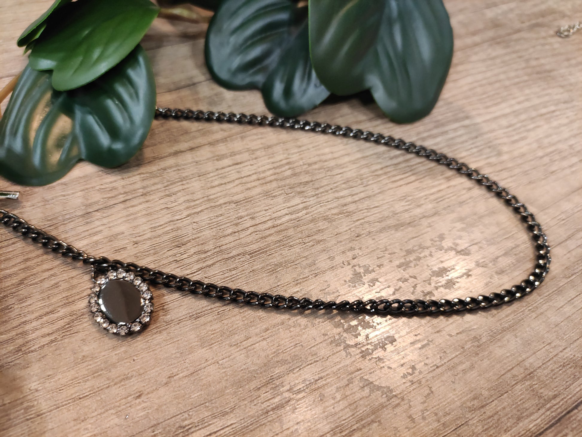 Catena da gilet con pendente ovale in ottone e contorno in strass Swarovski, realizzata a mano con lega in stagno e galvanica nichel free.