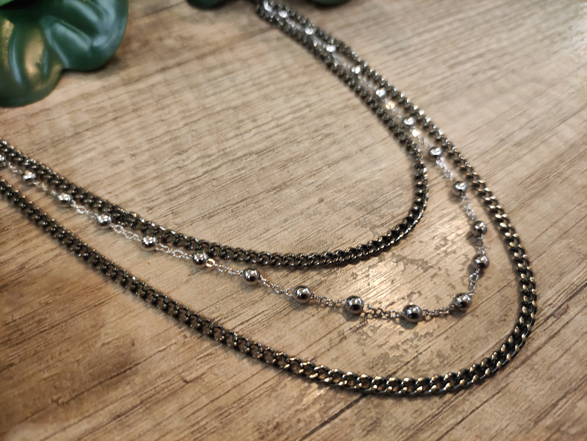 Tripla catena da gilet con catena tipo rosario in galvanica rodiata, realizzata a mano con lega in stagno e galvanica nichel free.