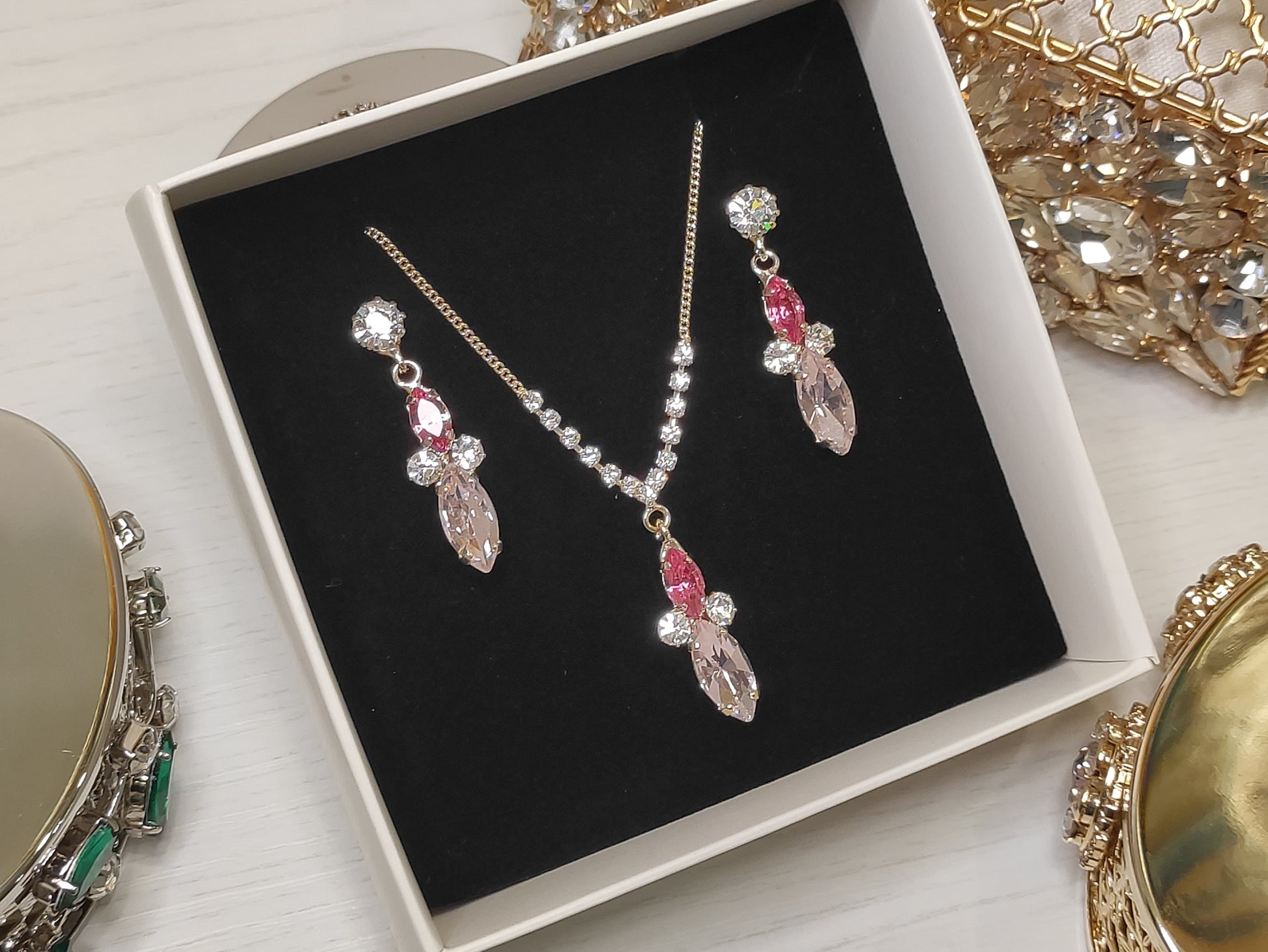 Parure composta da collana e orecchini in strass e pietre Swarovski, con galvanica oro nickel free, chiusura con moschettone tradizionale e catenina regolabile, orecchini con chiusura a vite, personalizzabile con galvanica argento.