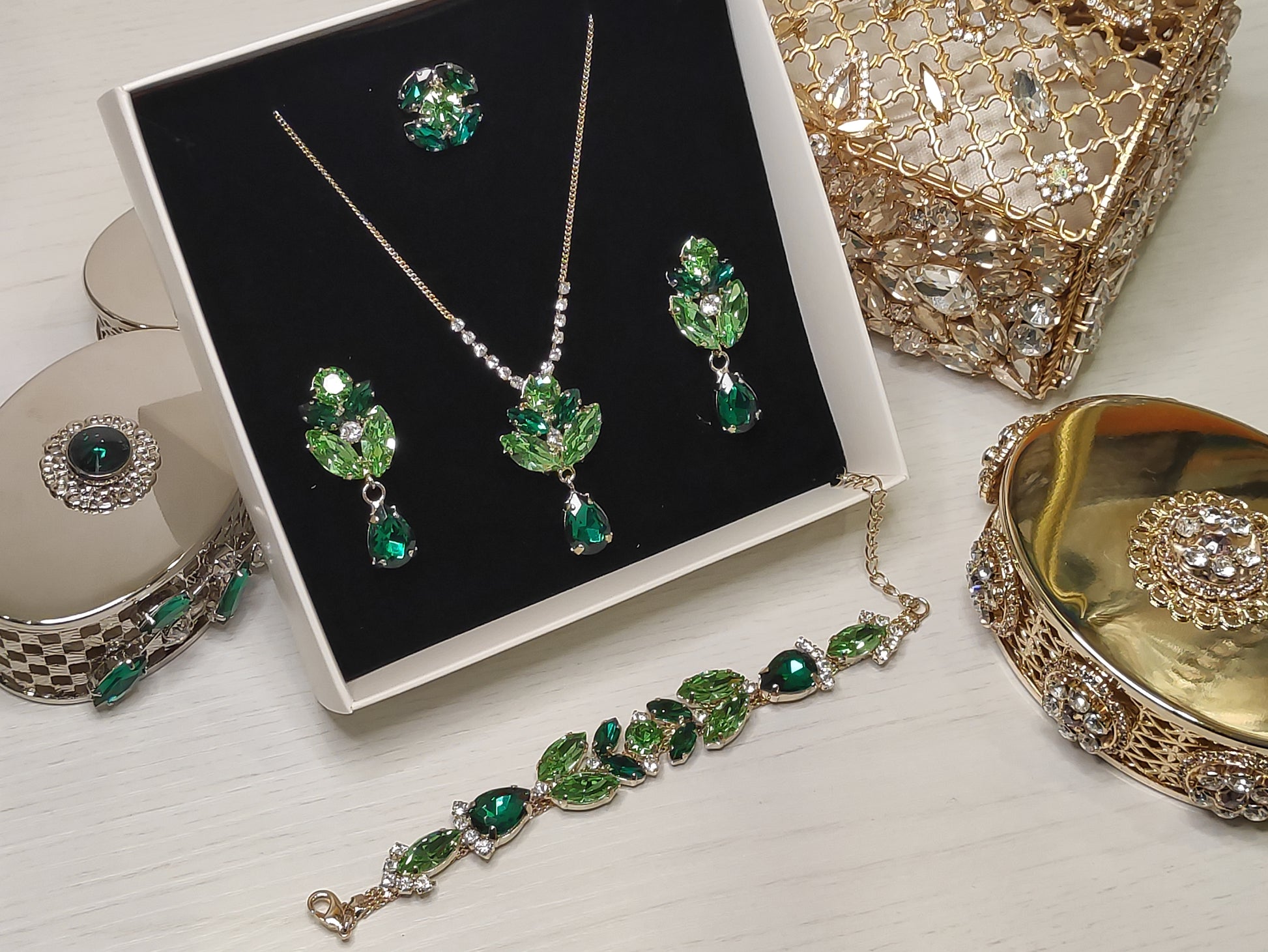 Parure composta da collana, orecchini e bracciale in strass e pietre Swarovski con galvanica oro nickel free, chiusura con moschettone tradizionale e catenina regolabile, orecchini con chiusura a vite, personalizzabile con galvanica argento.
