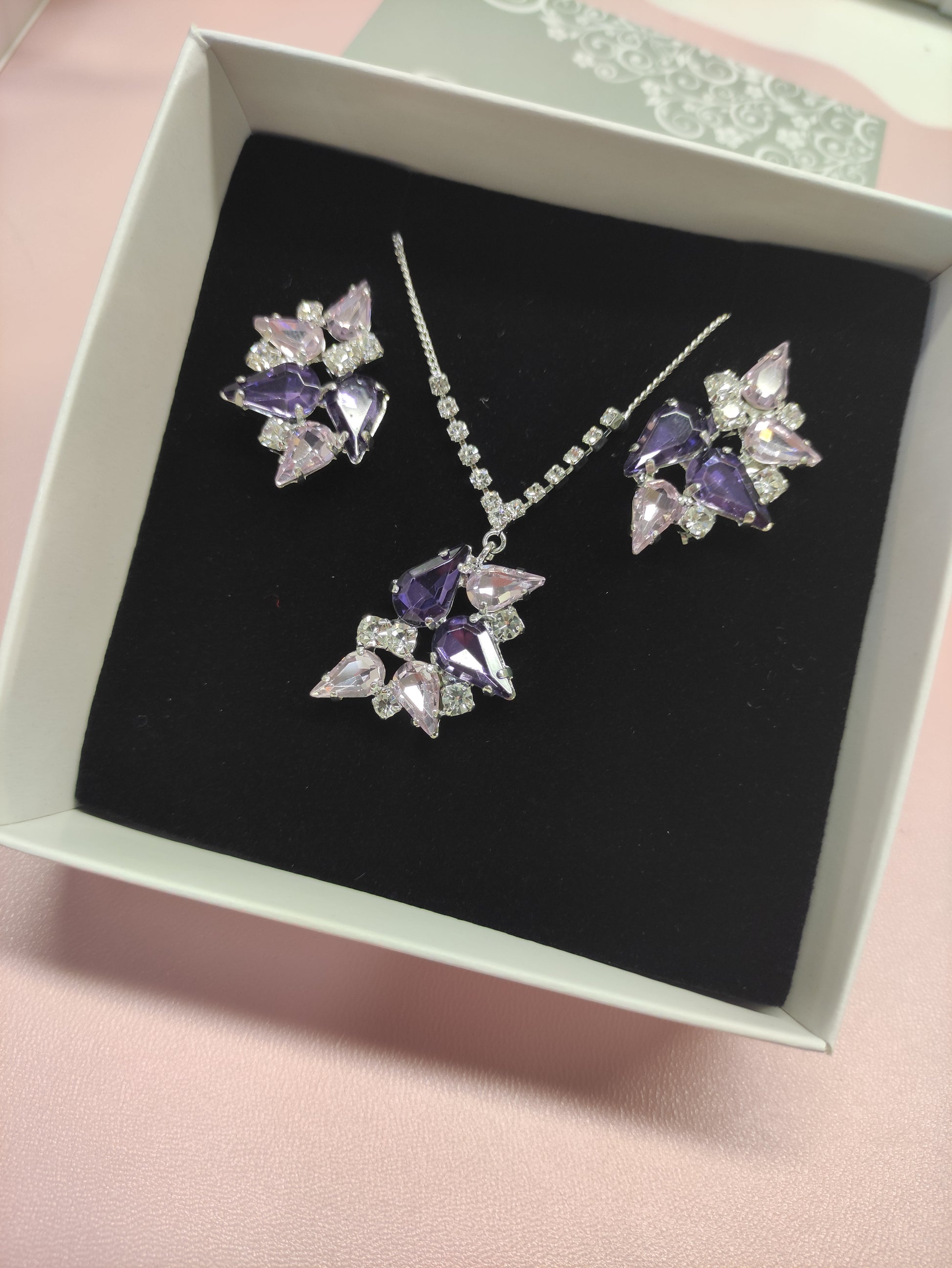 Parure composta da collana e orecchini in strass e pietre Swarovski, con galvanica argento nickel free, chiusura con moschettone tradizionale e catenina regolabile, orecchini con chiusura a vite, personalizzabile con galvanica oro.