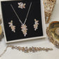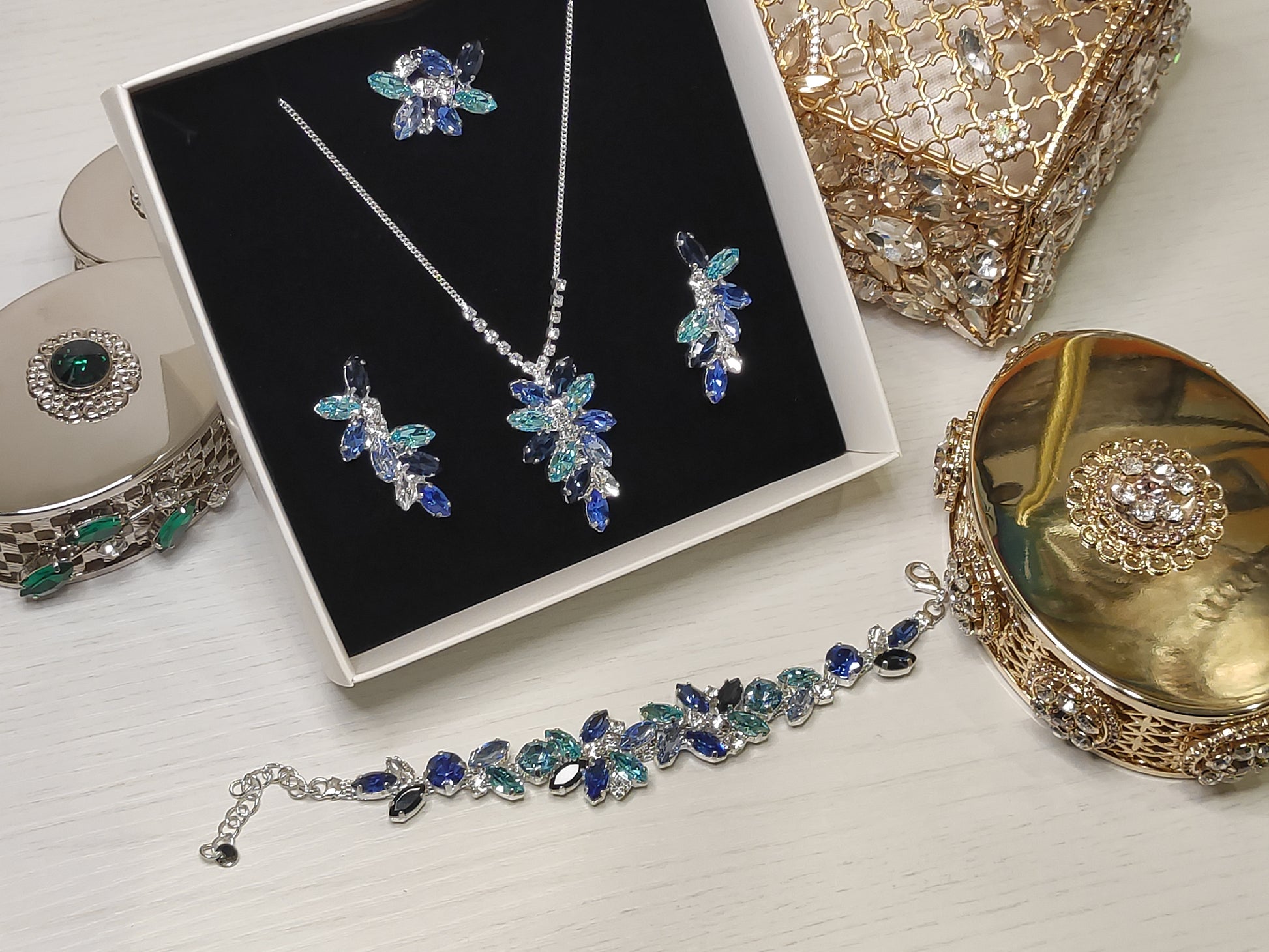 Parure composta da collana, orecchini, bracciale e anello in strass e pietre Swarovski con galvanica oro nickel free, chiusura con moschettone tradizionale e catenina regolabile, orecchini con chiusura a vite, personalizzabile con galvanica argento.