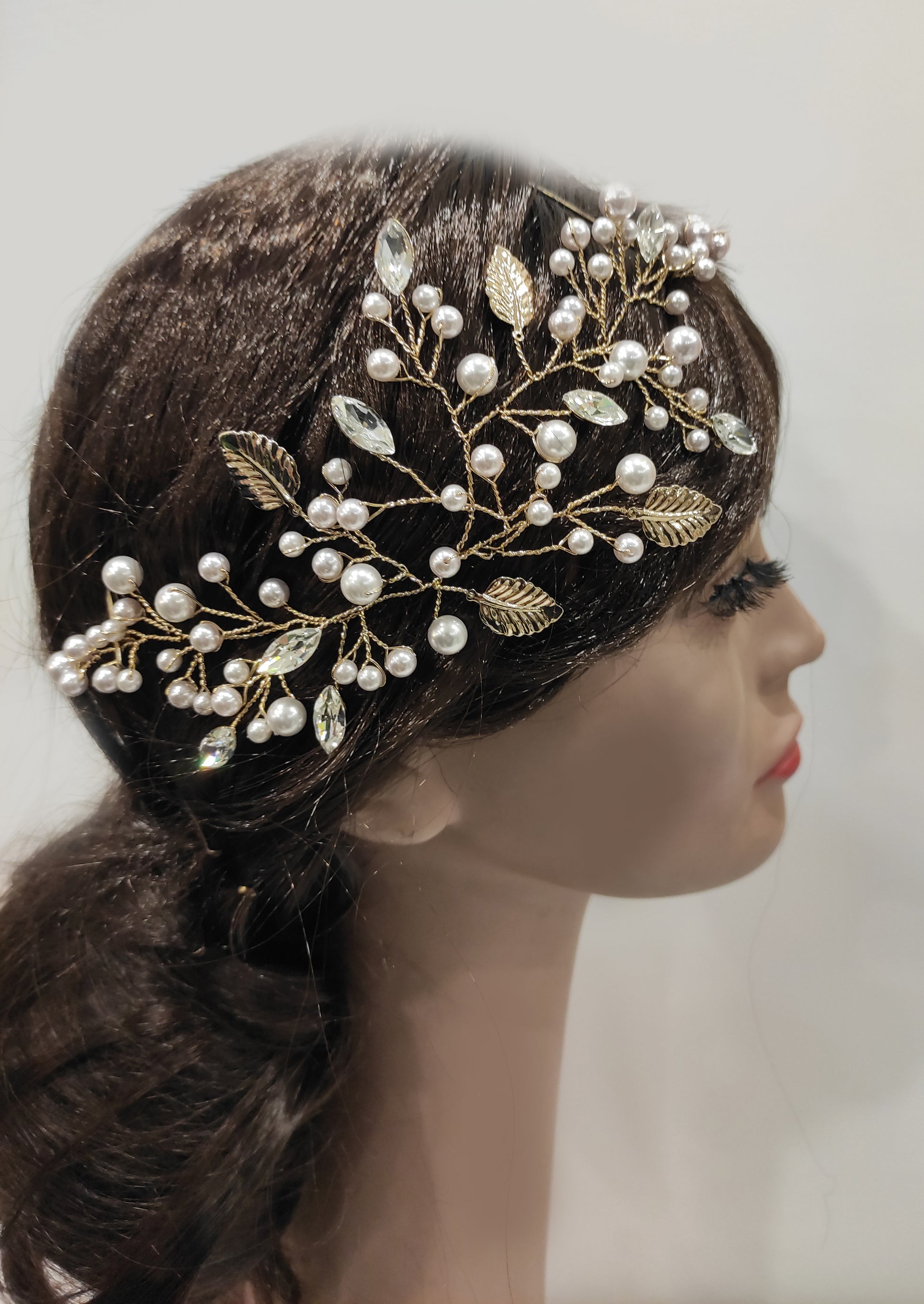 Accessorio bijoux modellabile, con perle e pietre swarovsky e foglioline in ottone, fatto a mano, made in italy, personalizzabile.