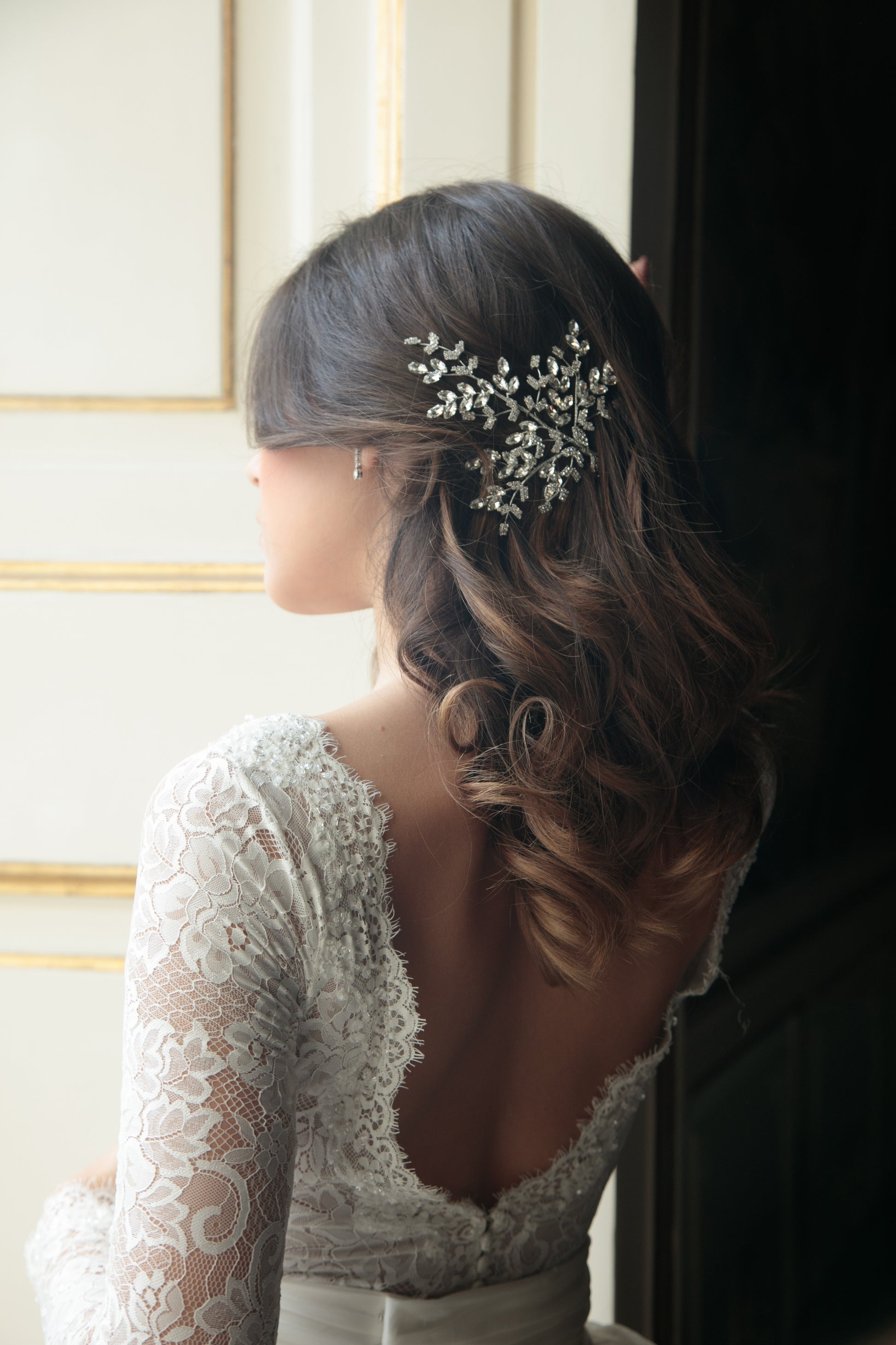 Applicazione laterale bijoux da sposa, lavorazione con elementi in strass e pietre swarovski, fatto a mano, made in Italy, personalizzabile.