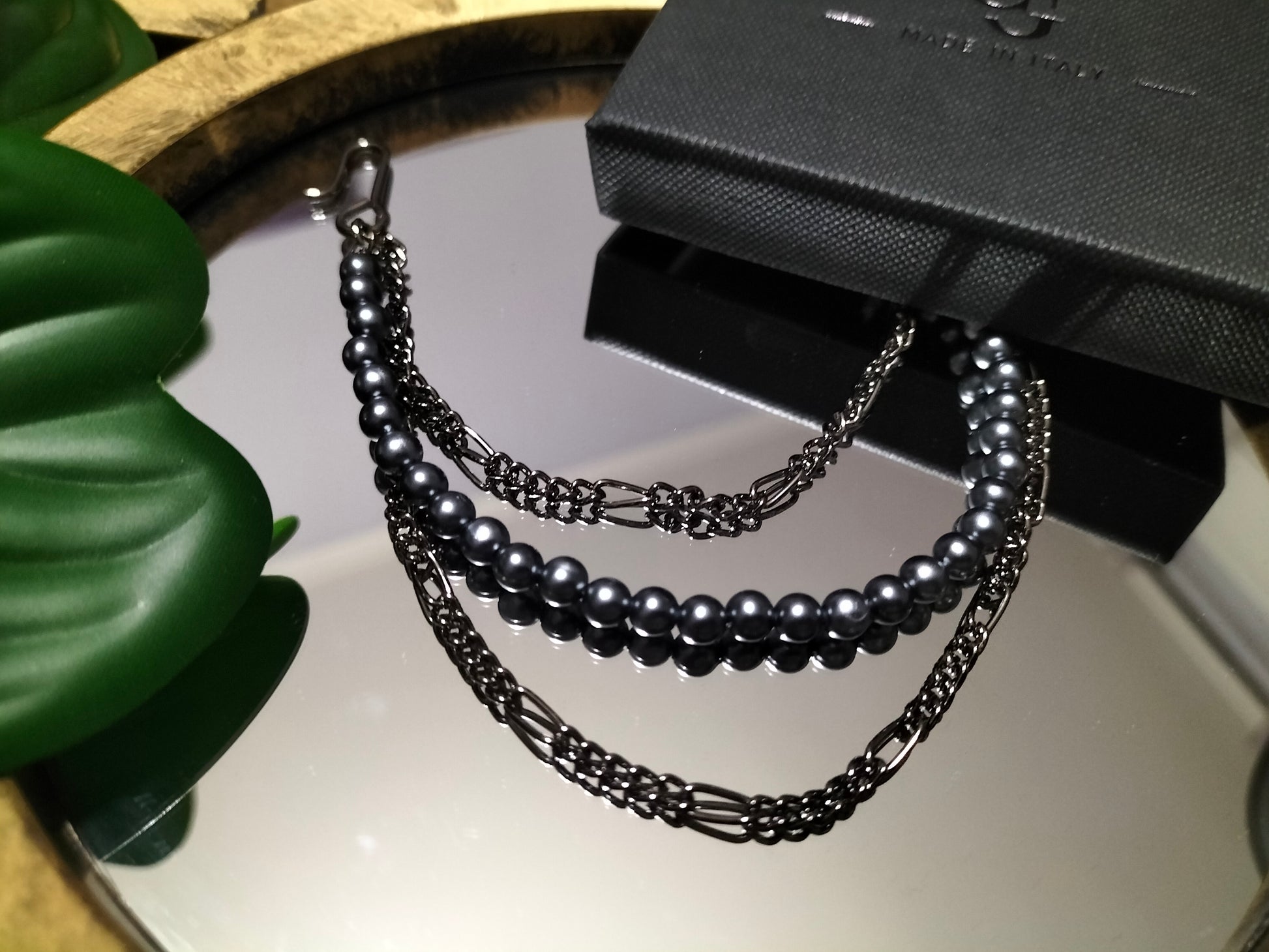 Tripla catena da gilet con perle bijoux ed elementi in ematite, realizzata a mano con lega in stagno e galvanica nichel free.