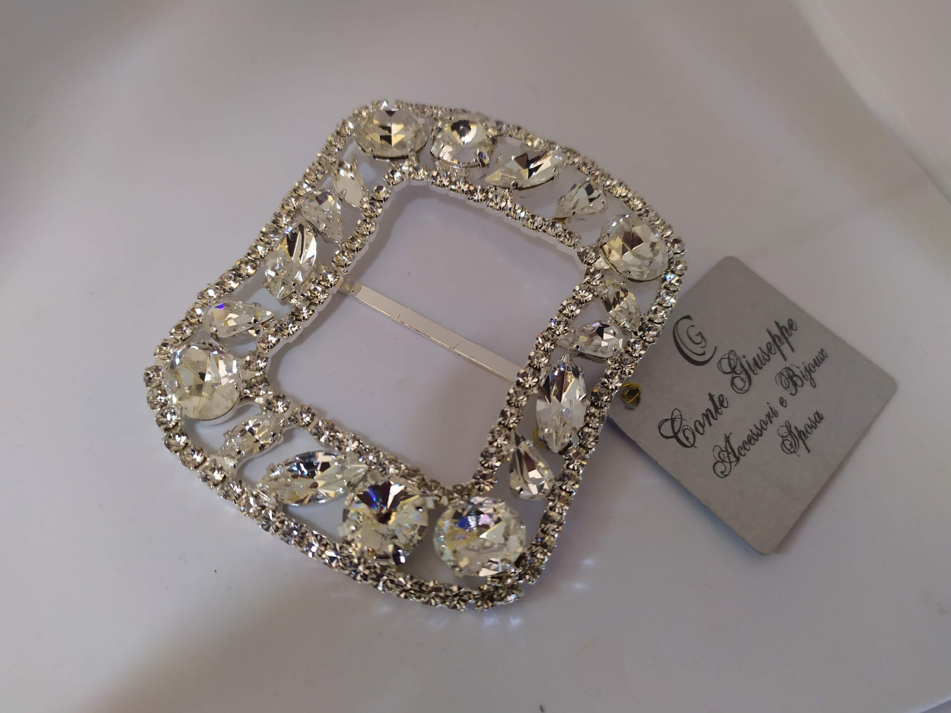 Fibbia bijoux, da applicare su cinture in tessuto. Lavorazione con pietre e strass Swarovski e Preciosa, con passante. Lega in stagno e galvanica nichel free.