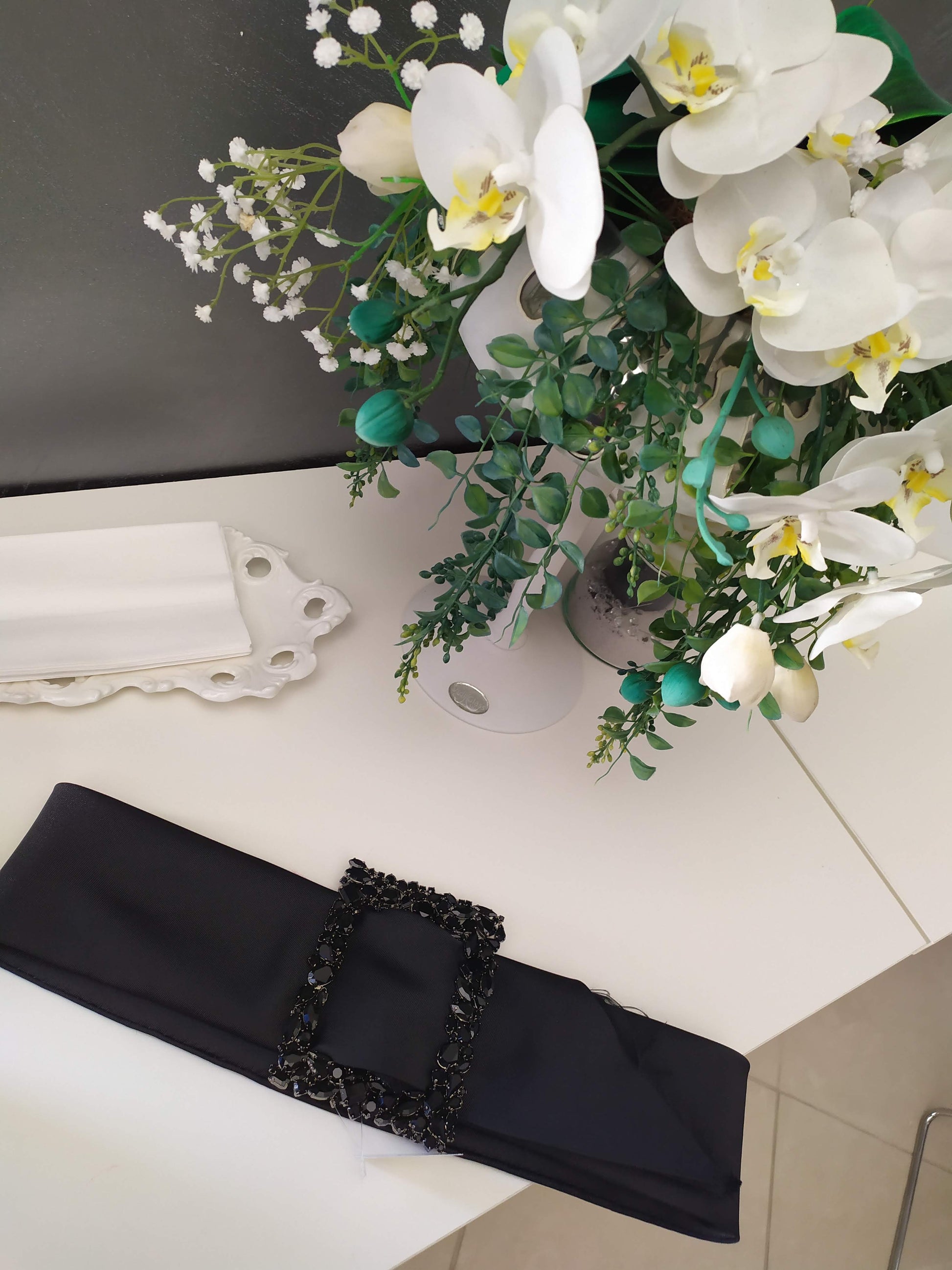 Fibbia bijoux, da applicare su cinture in tessuto. Lavorazione con pietre e strass Swarovski e Preciosa, con passante. Lega in stagno e galvanica nichel free.